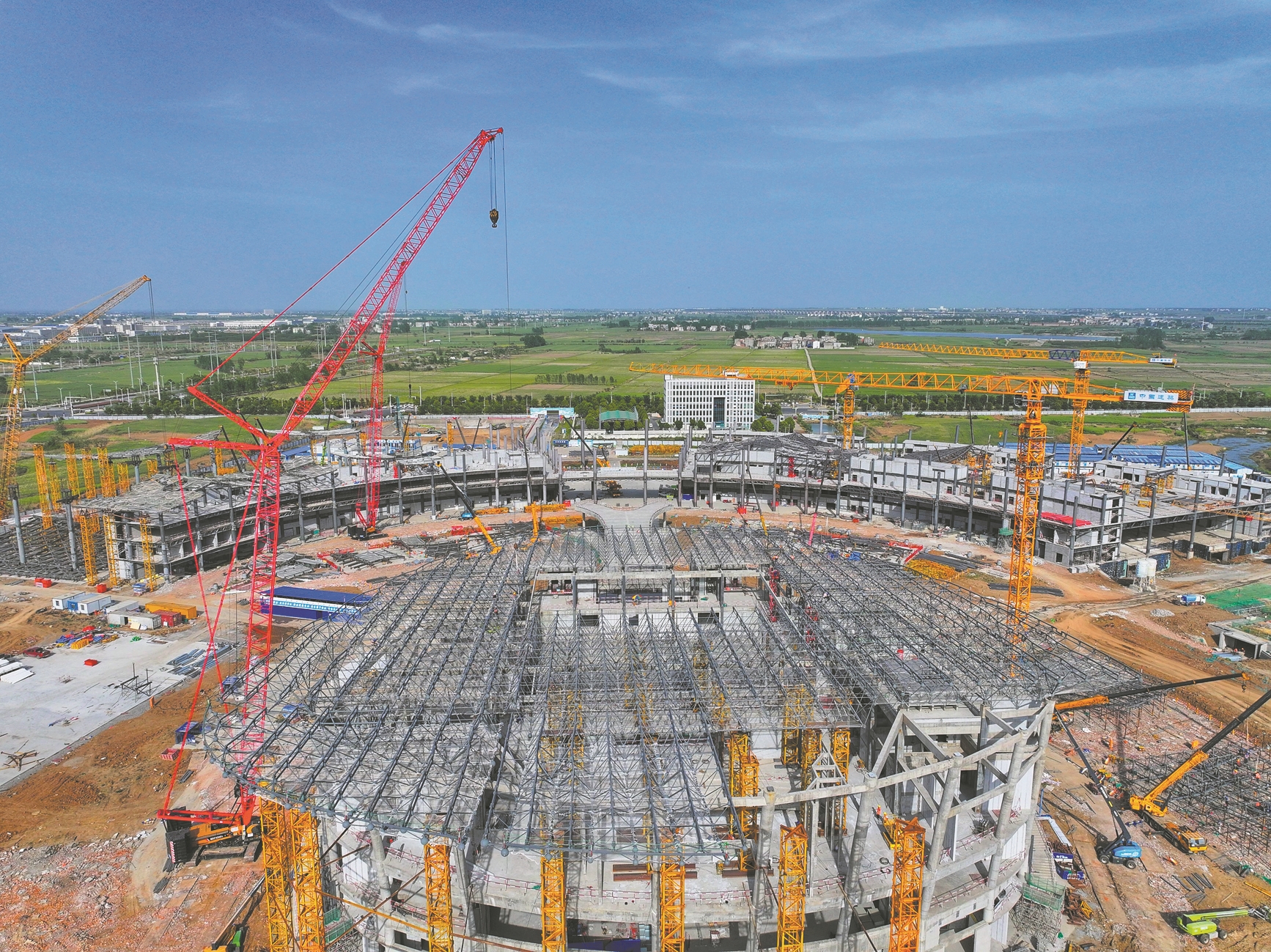 4月16日,工人忙着对汉江流域现代农业贸易中心项目进行屋面网壳、网架施工。