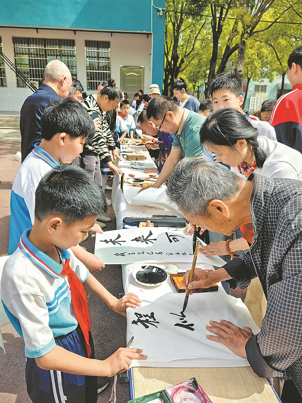 襄阳晚报讯【全媒体记者朱月皎 通讯员李晓】4月23日是第30个世界读书日,襄州区老年大学组织书画专业学员走进石桥镇中心小学,开展“大手牵小手·墨香伴书香”主题活动。“老”同学们以书画为媒,与“小”同学们共品传统文化魅力,传递阅读与奋进的力量,活动现场书香氤氲、翰墨飞扬(如图)。