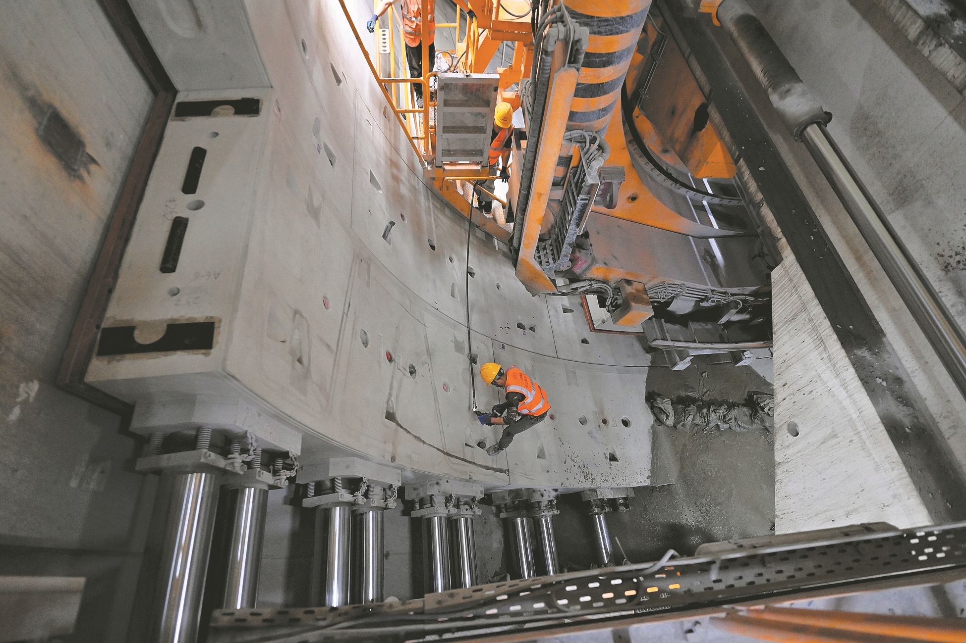 4月22日,在保康县马良镇的引江补汉工程4标8号平洞,中铁十八局工人在“汉江先锋号”掘进机内作业。