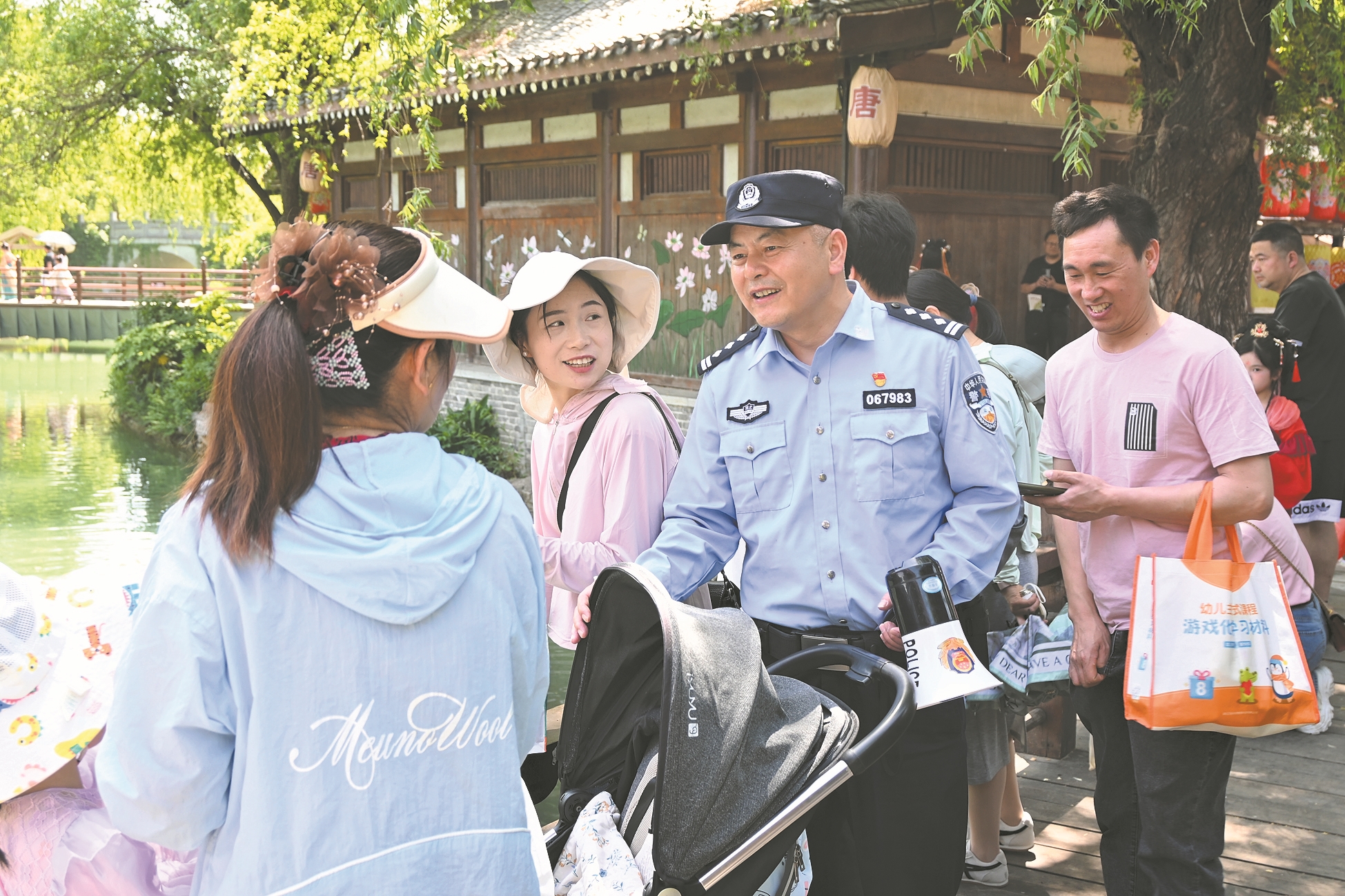 5月1日,在唐城景区,市公安局襄城区分局庞公派出所民警吴双泉为游客提供服务。“五一”假期,全市公安机关日均投入警力2800余人次,对繁华商圈、旅游景区、交通枢纽等重点部位和人员密集场所开展巡逻防控,切实提高见警率、管事率。