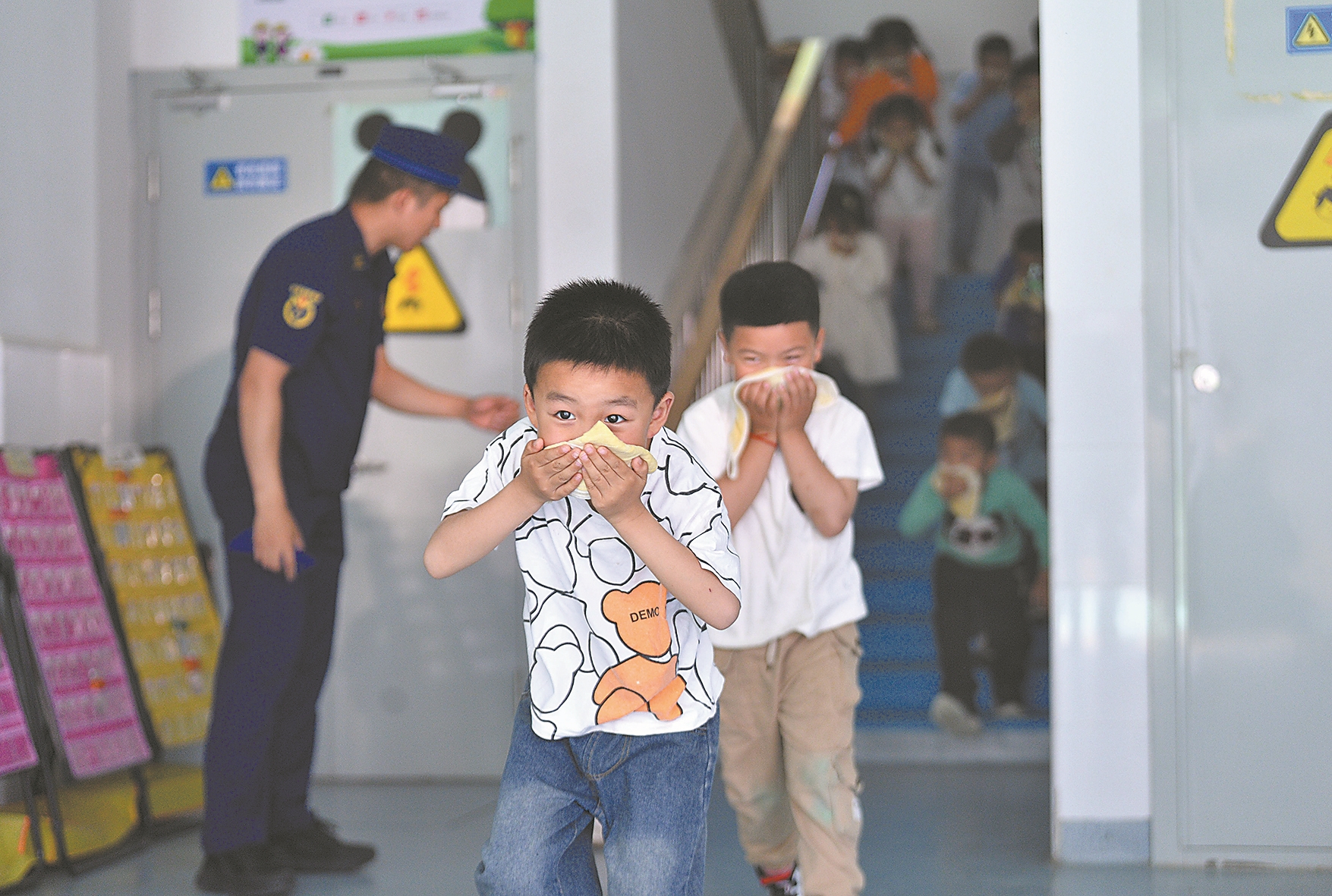 5月12日,在保康县县直机关第二幼儿园,孩子们在消防员的指导下进行火灾应急疏散演练。