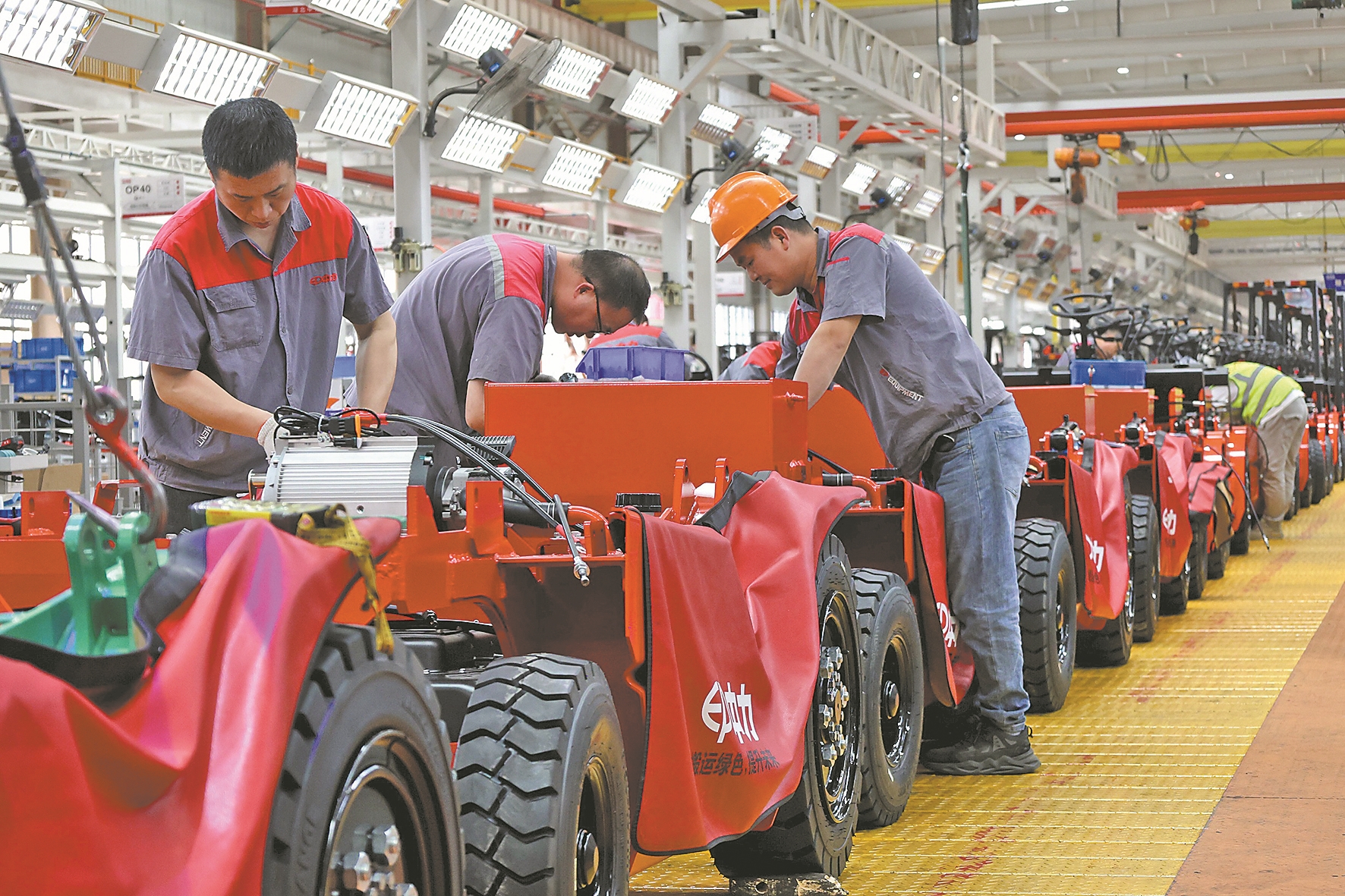 近日,在中力电动叉车老河口市生产基地,工人们正专注有序地进行设备组装作业。