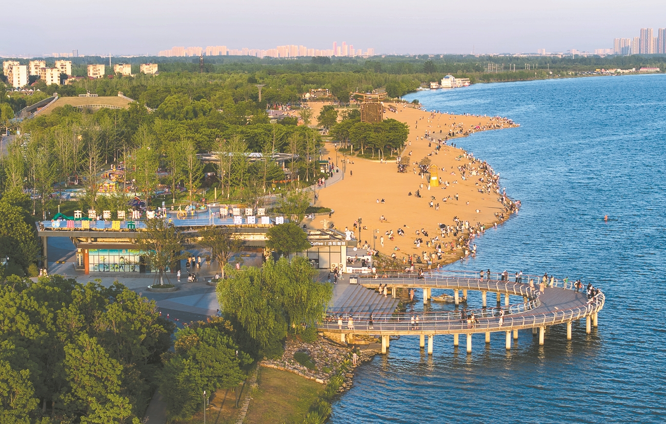 5月11日,鱼梁洲汉江岸线风景如画,游人如织。近年来,我市对鱼梁洲进行生态修复,建成约23公里的环岛绿道,为市民和游客提供了运动休闲的好去处。