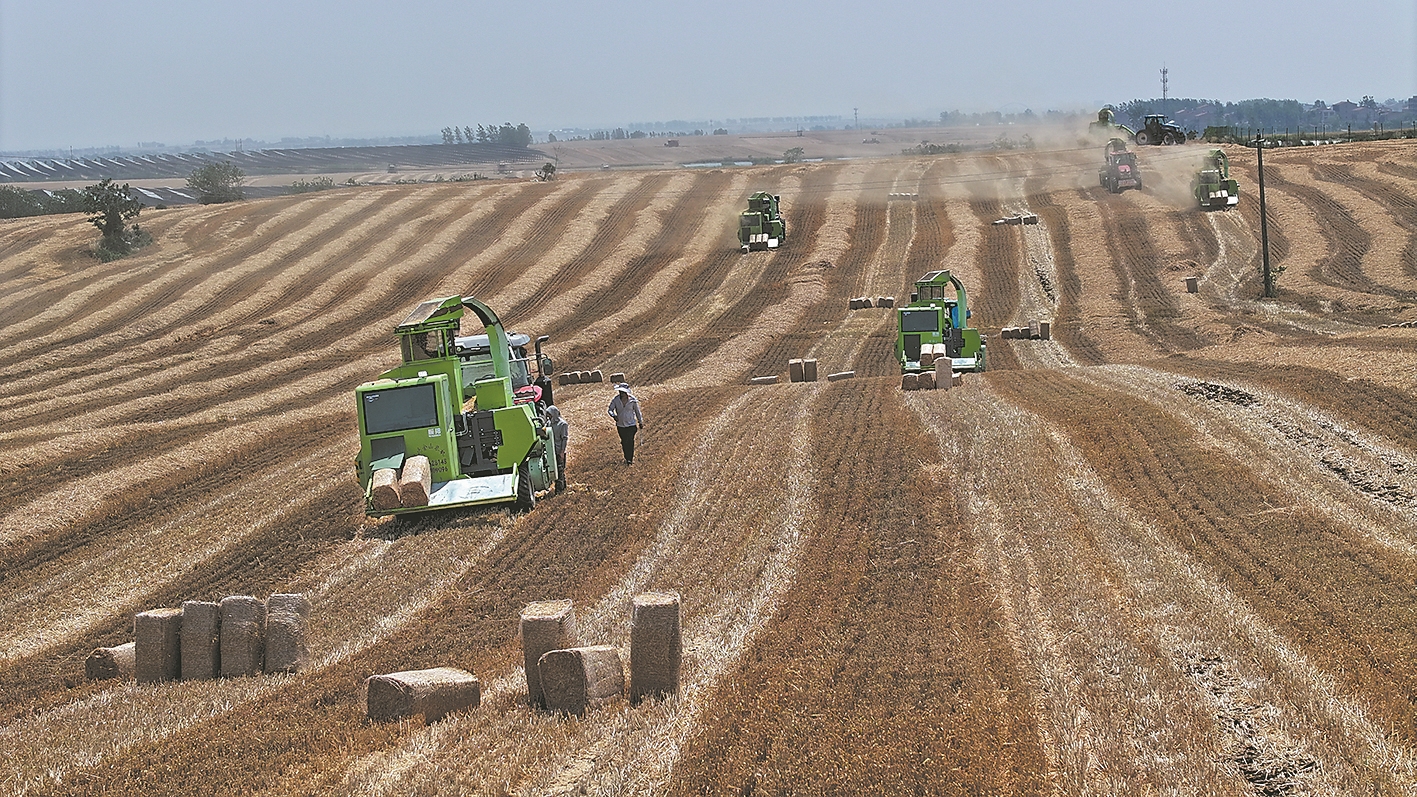 5月16日,在襄州区古驿镇,农机手驾驶农机在田间回收小麦秸秆。据农机手介绍,平均3亩地可以回收1吨小麦秸秆,每吨秸秆可以卖550元。当天,他们回收了1000亩地的小麦秸秆。