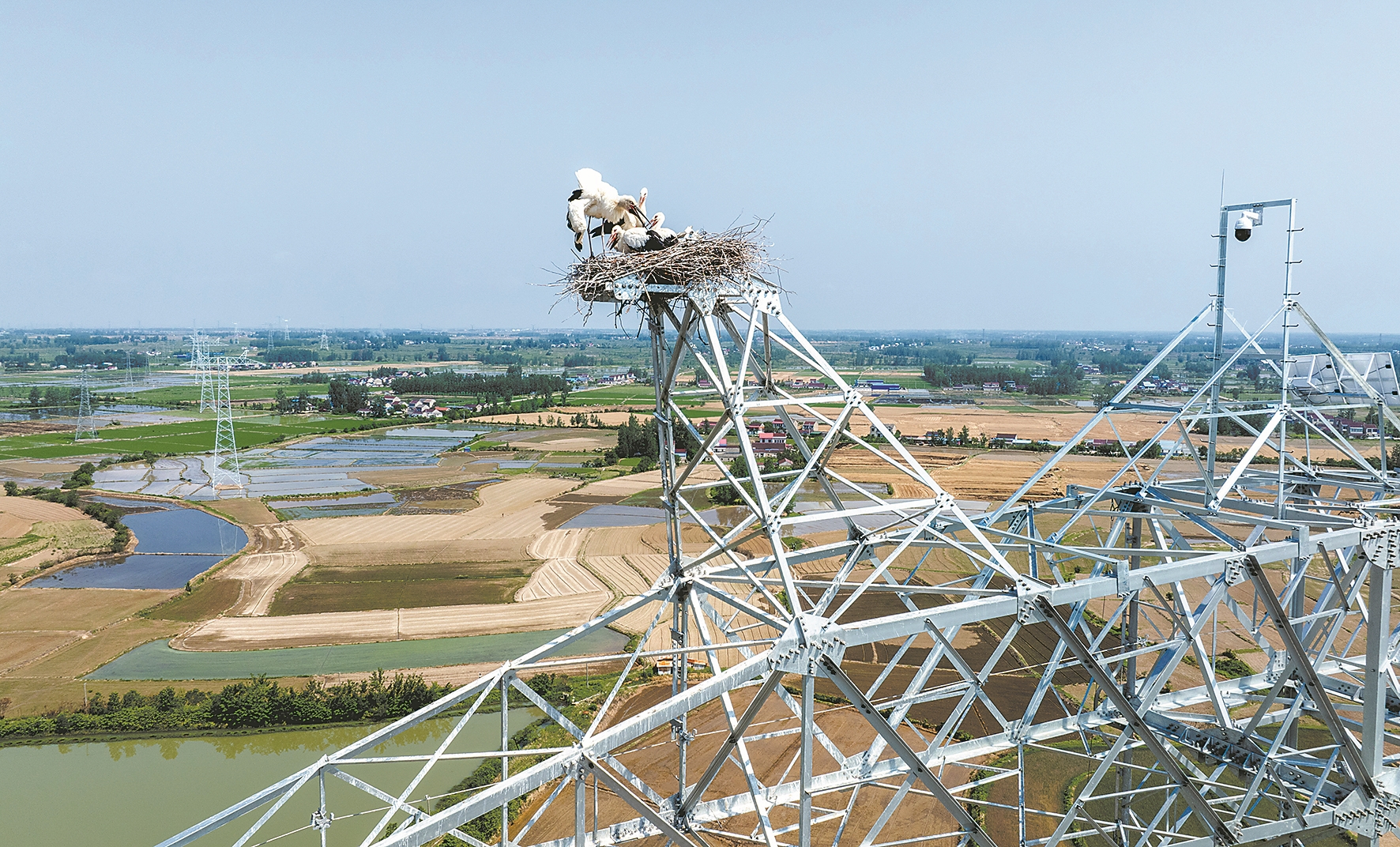 在相关部门指导下,国网安徽电力部门在鸟巢附近安装高清摄像头,安排专人跟踪保护,并根据东方白鹳育雏周期推迟施工进度,实现生态保护和电网发展“双向奔赴”。 新华社 发