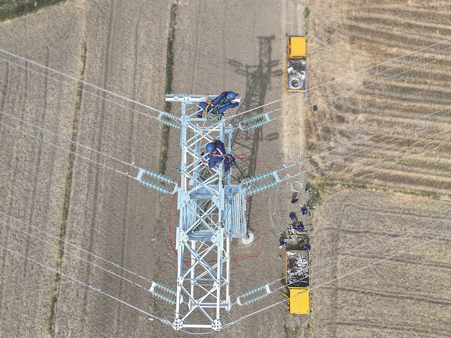 近日,襄阳电力集团有限公司旭能工程分公司电力工人在平林—财庙输电工程铁塔上搭接引流线。