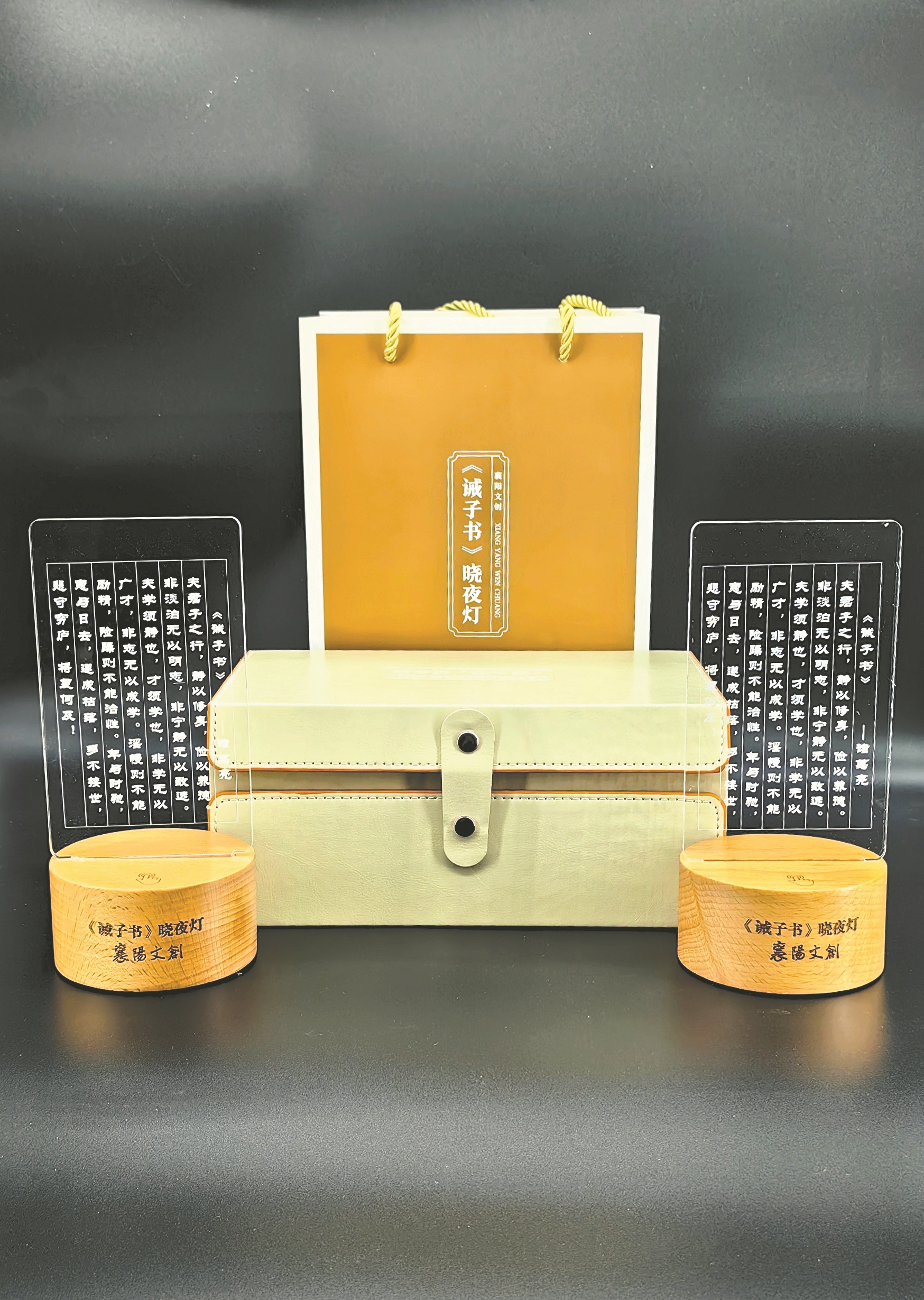 《诫子书》是三国时期蜀汉丞相诸葛亮临终前写给儿子诸葛瞻的一封家书,短短86字,蕴含着“修身、齐家、治国、平天下”的深刻哲理。《诫子书》晓夜灯正是以这篇传世名篇为设计灵感,采用阴刻工艺,在亚克力灯体上雕刻《诫子书》全文,通过三色LED光影技术,让静态的文字在明暗变化间焕发新生,让传统文化以更鲜活的方式融入现代生活。