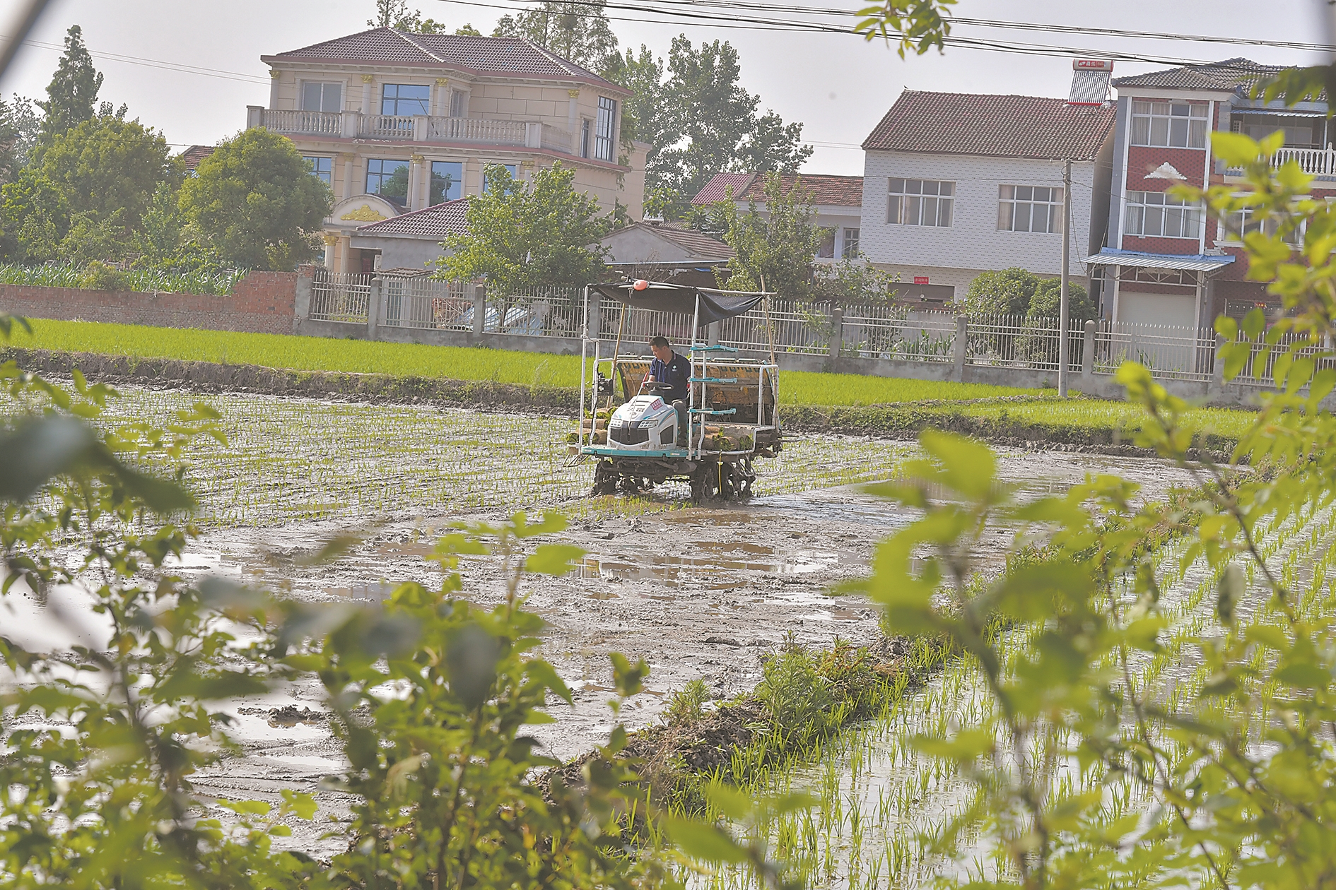 5月29日,在南漳县九集镇泉水堰村,农民驾驶插秧机在麦收后整田覆水的田块里插秧。