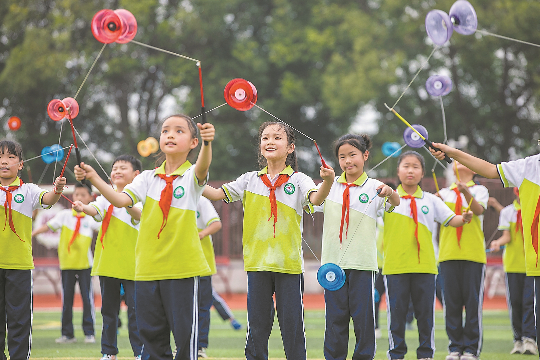 6月5日,樊城区竹条中心小学的学生利用课间在操场上练习抖空竹。近年来,樊城区持续推动民族传统体育项目进校园,将抖空竹等民俗活动融入课间活动,让孩子们在锻炼身体的同时,感受传统民俗文化的魅力。 全媒体记者李旭晖 通讯员聂志鹏 杨红玫 摄