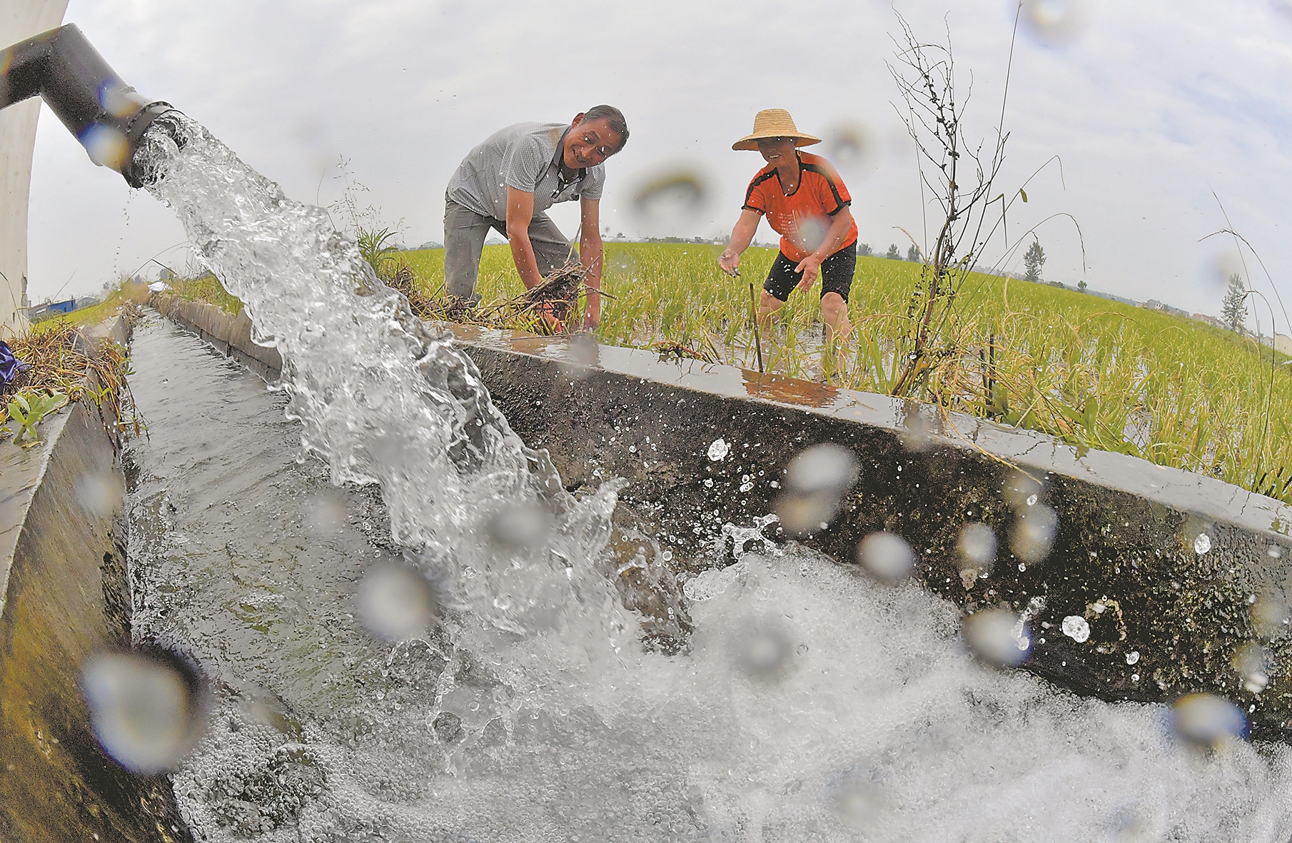 6月6日,在襄城区尹集乡千弓村,农民用机井抽水灌溉秧苗。