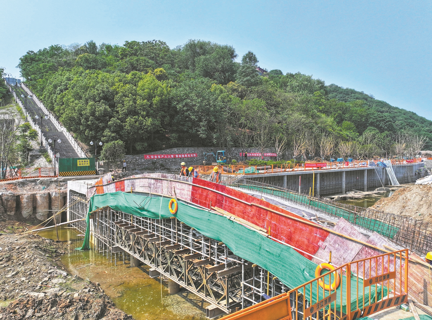 6月11日,汉江城建集团施工人员忙着为真武桥安装支护模板。