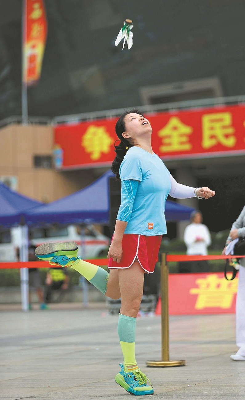 毽球专业运动员为广大市民展示了毽球基础技法、特色套路。其中,多人表演的花式毽球将个人技巧与团队协作展现得淋漓尽致。抬腿、跳跃、屈体、转身,伴随着一次次漂亮的进攻和惊险的防守,毽球上下飞舞,赢得现场市民阵阵掌声。
