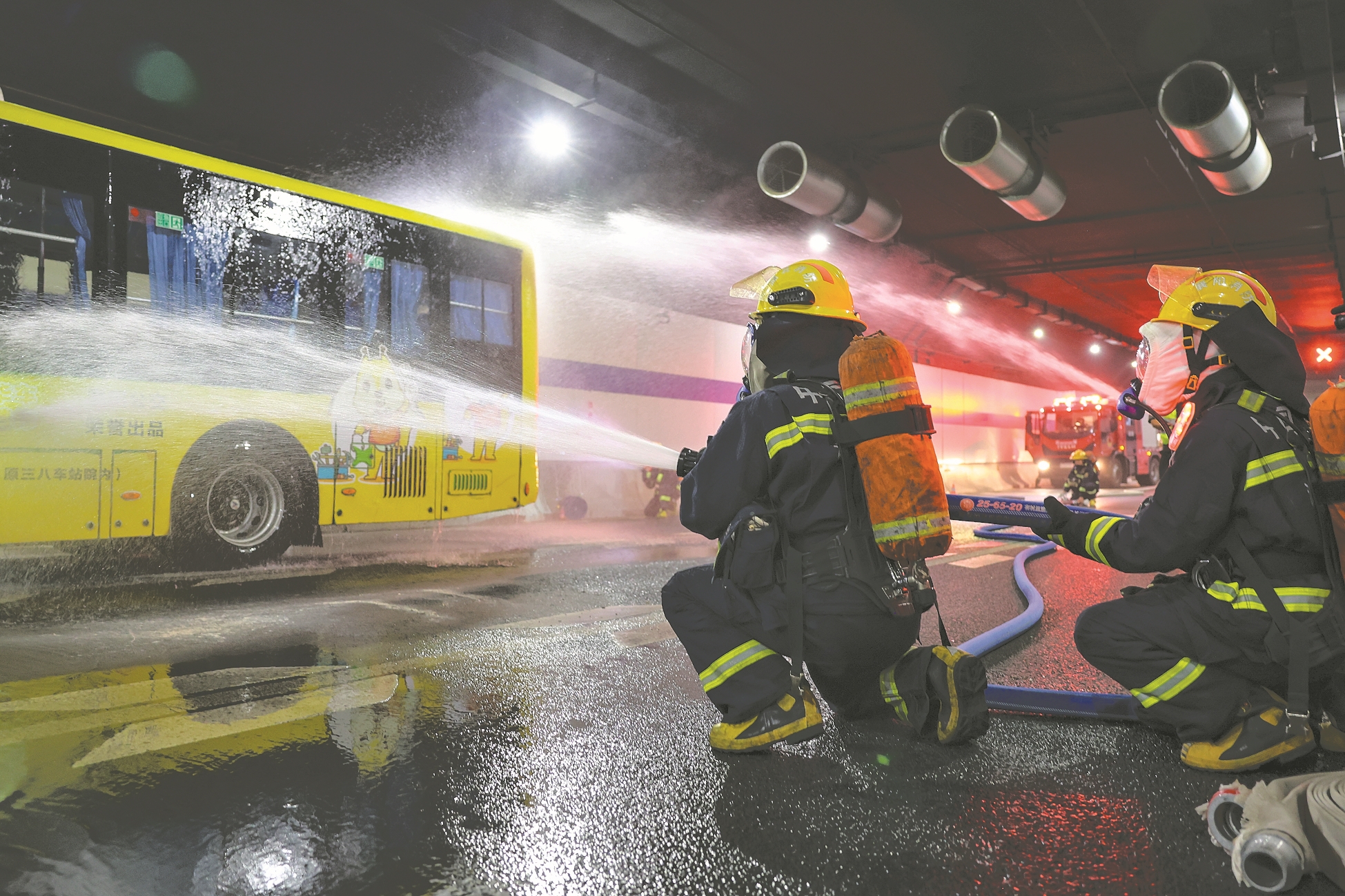 6月12日,在鱼梁洲隧道极端降雨天气综合应急演练中,滞留公交车冒烟起火,消防员抵达现场,使用高压水枪灭火。