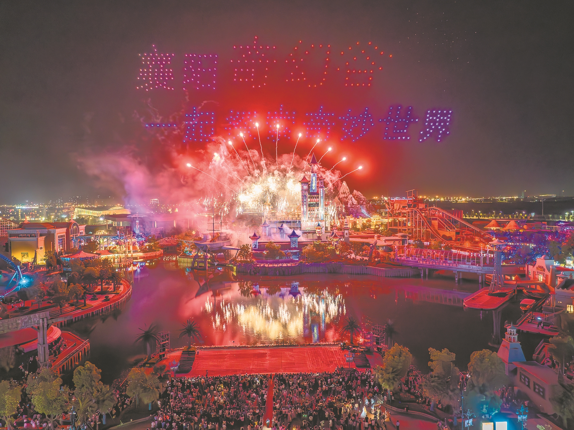 在华侨城奇幻度假区,千架无人机化作银河倾泻,与漫天烟花共舞“奇梦光影秀”,科技与浪漫在此完美交融;