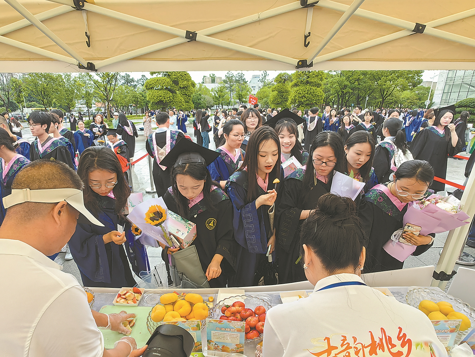 现场布置充满青春与地域特色。“桃礼打卡点”融合了中南财经政法大学校徽、鲜桃形象及毕业季标语,成为毕业生争相合影留念的热门背景。展台上,精心包装的“桃礼盲盒”与“枣阳皇桃”品种展示台相映成趣,图文并茂的介绍让师生深入了解了“枣阳皇桃”的优良品质与文化底蕴。