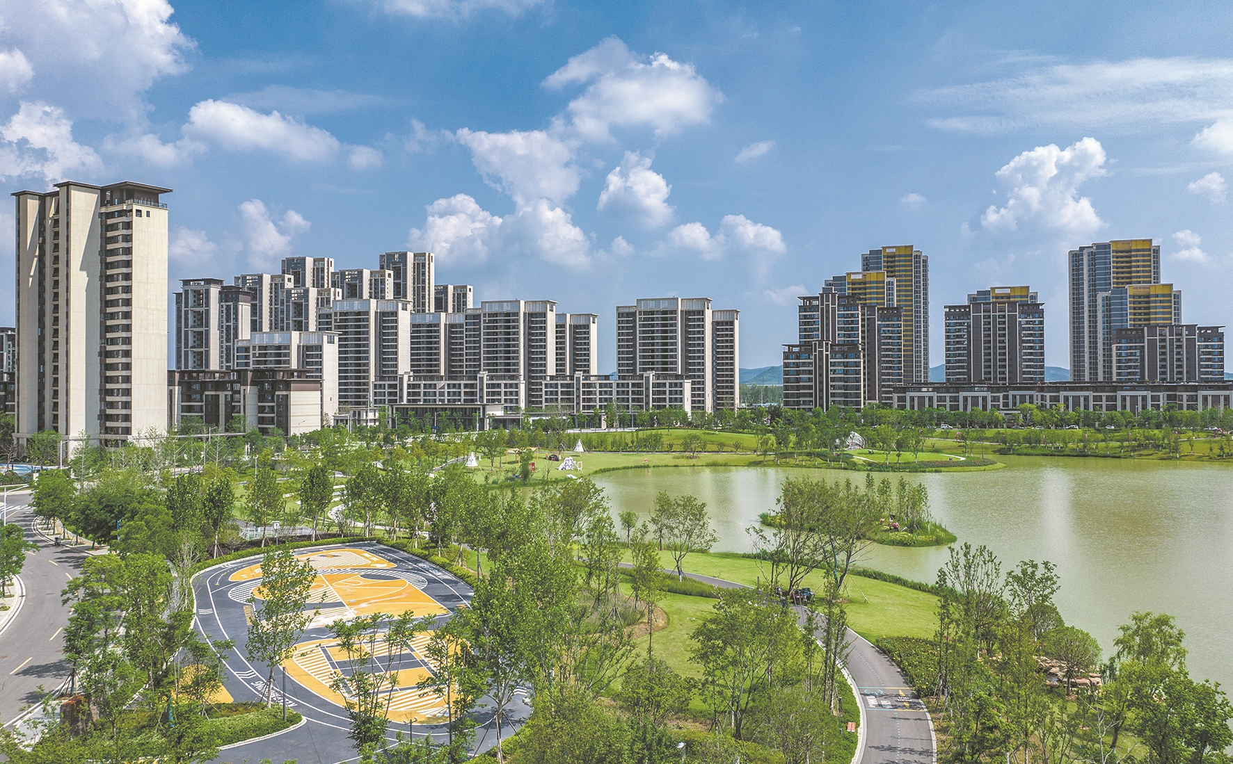 6月23日,东津新区鹿鸣公园与城市建筑相映成趣,绘就出一幅城市美景图。