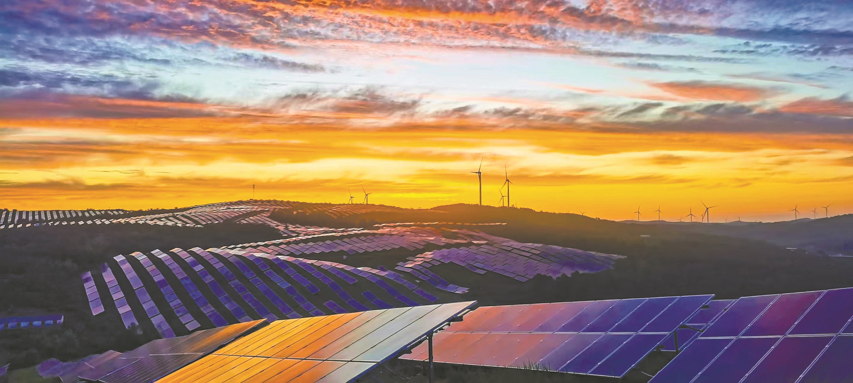 6月26日,枣阳市太平光伏绿色能源基地流光溢彩。近年来,枣阳市在太平镇康河村一带,利用荒山建设3000亩光伏发电项目、60个机组风力发电项目,昔日荒山变成了风光互补的绿色能源基地。 通讯员 李明 摄