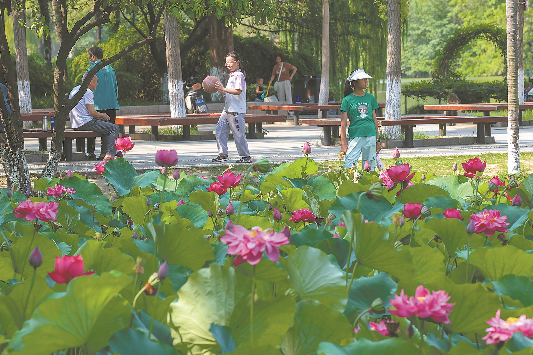 7月7日,市民在襄阳市环城公园游玩赏荷。近日,襄阳市环城公园里的荷花相继绽放,荷叶层层叠叠随风摇曳,荷花星星点点伫立叶间,吸引不少市民前来游玩,尽享惬意夏日时光。