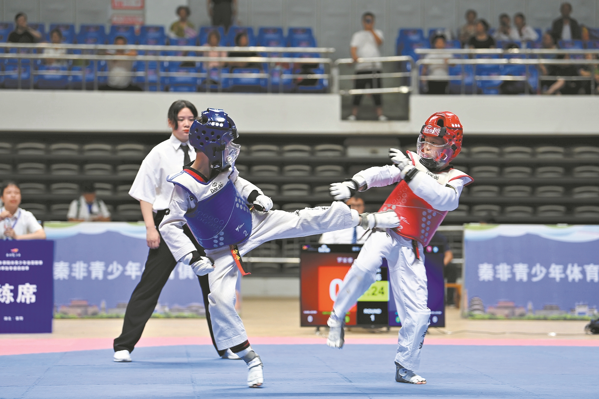 当日,“阳光体育”2025年襄阳市青少年体育联赛暨湖北省锦标赛跆拳道选拔赛在襄阳体育馆举行,169名青少年参赛,争夺晋级资格。