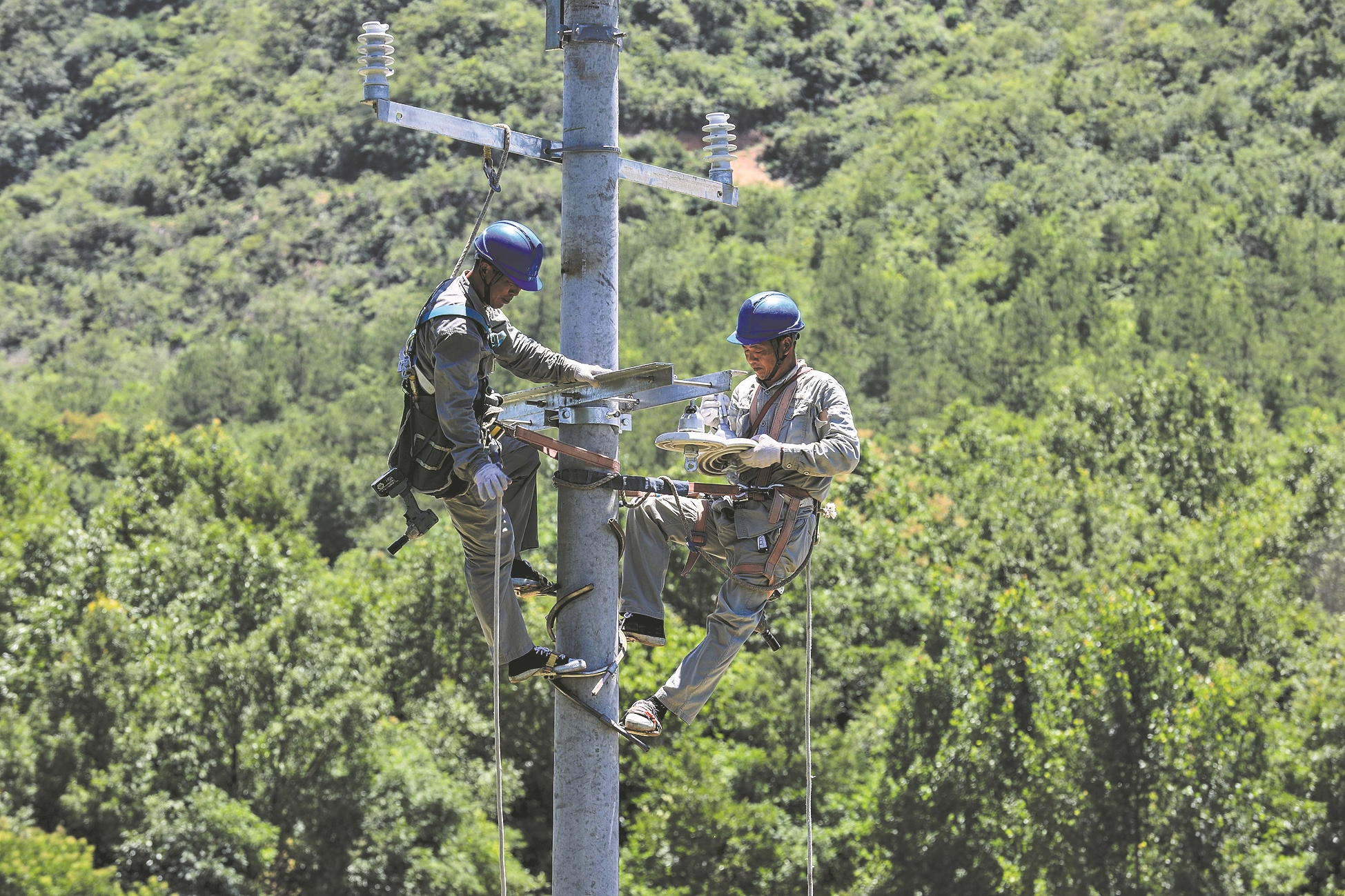 7月4日,太平镇电力抢修现场,工作人员挥汗如雨进行高空作业。