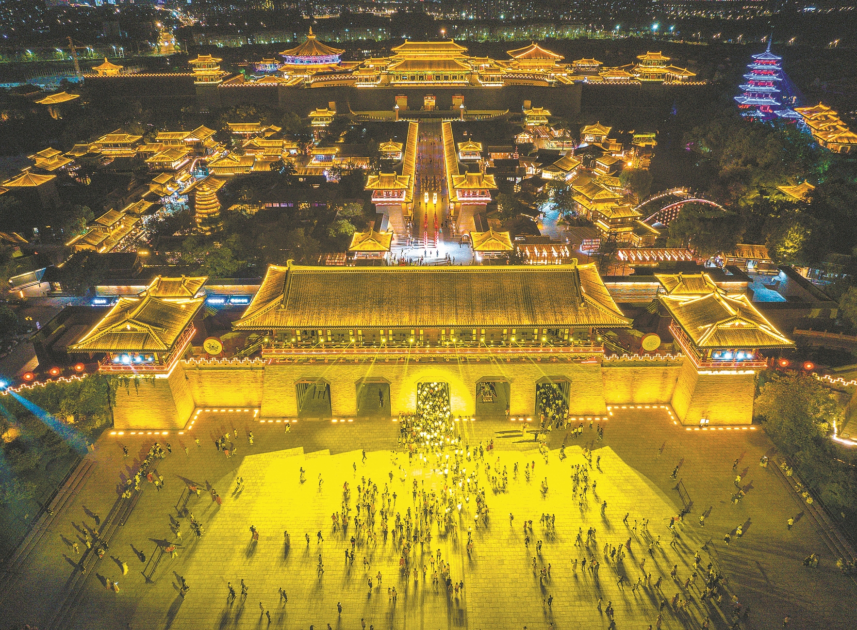 7月13日晚,襄阳唐城景区夜景璀璨,游人如织。