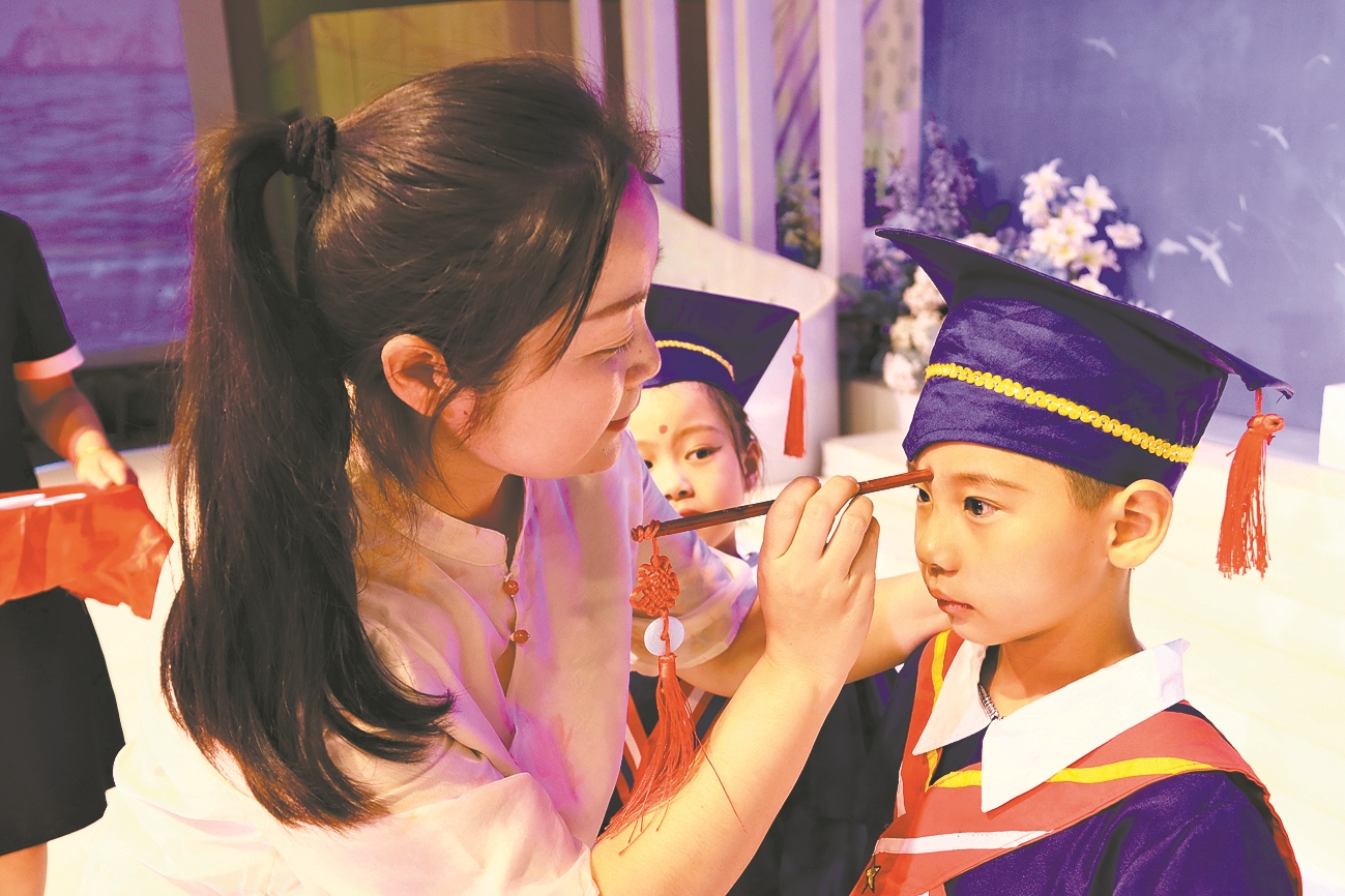 “一点朱砂入心房,心明眼亮开吉祥。”7月11日,襄州区暻皇幼儿园毕业典礼上,老师轻点学童眉心,用传统文化里的“点朱砂”为孩子们“开智”,祈愿孩子们从此“眼明心亮,好读书、读好书”。