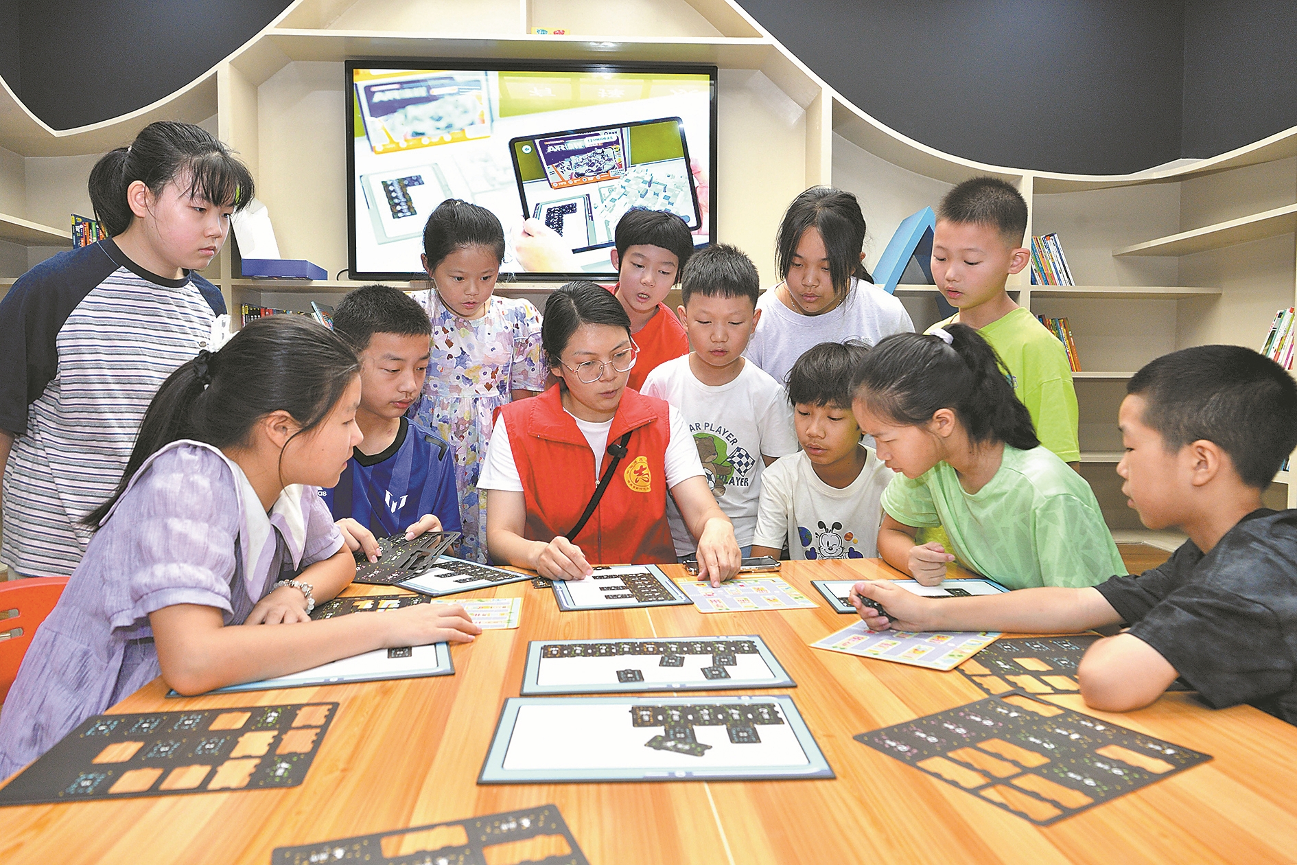 7月14日,在保康县科技馆创客体验室,工作人员给学生讲解AR编程的方法。暑假期间,保康县科技馆充分利用馆内科普资源,开设机器人编程、科学小实验、电子百拼、手工制作等公益科学课程,培养学生对科学技术的兴趣和爱好。