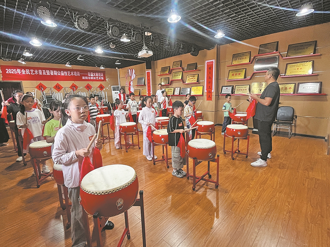 今夏,襄阳市群众艺术馆化身为火爆的“暑期文化加油站”。7月1日,市群众艺术馆2025年度全民艺术普及暨暑期公益培训正式开课,有非遗大鼓、少儿街舞、口才表达、硬笔书法四门课程,100个名额在1小时内被家长们“秒光”。开课当天,馆内处处是孩子们专注学习的身影,门外则是满怀期待守候着的家长。