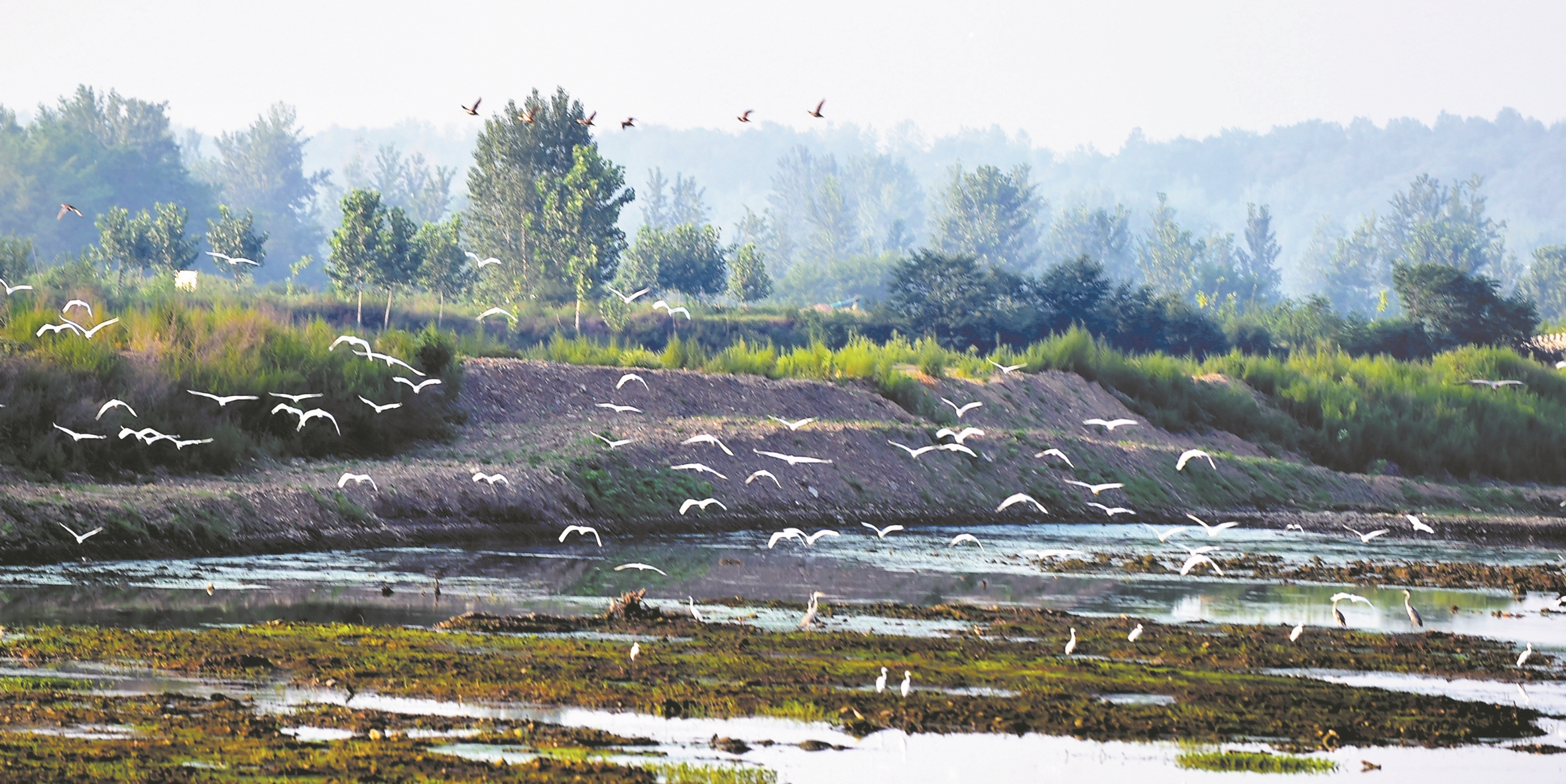 7月16日,在南漳县清河管理区白鹤湖社区,千只白鹭展翅翱翔,蔚为壮观。