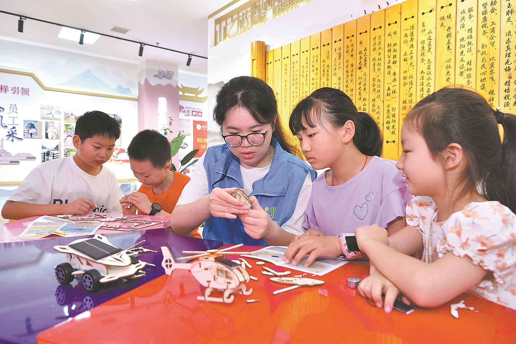 7月22日,在保康县“青年之家”旗舰店开办的暑托班上,大学生志愿者指导学生制作“太阳能直升机”。
