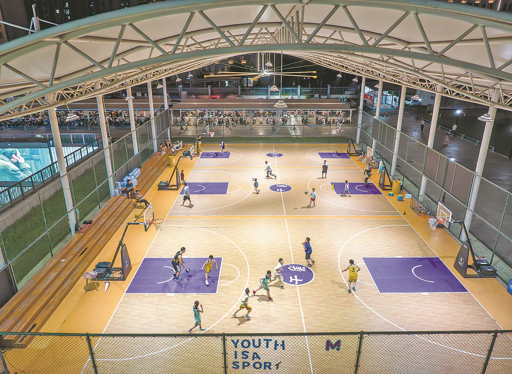 7月26日晚,襄城区檀溪路美联M·PARK外广场灯火璀璨,孩子们在运动场上打篮球。