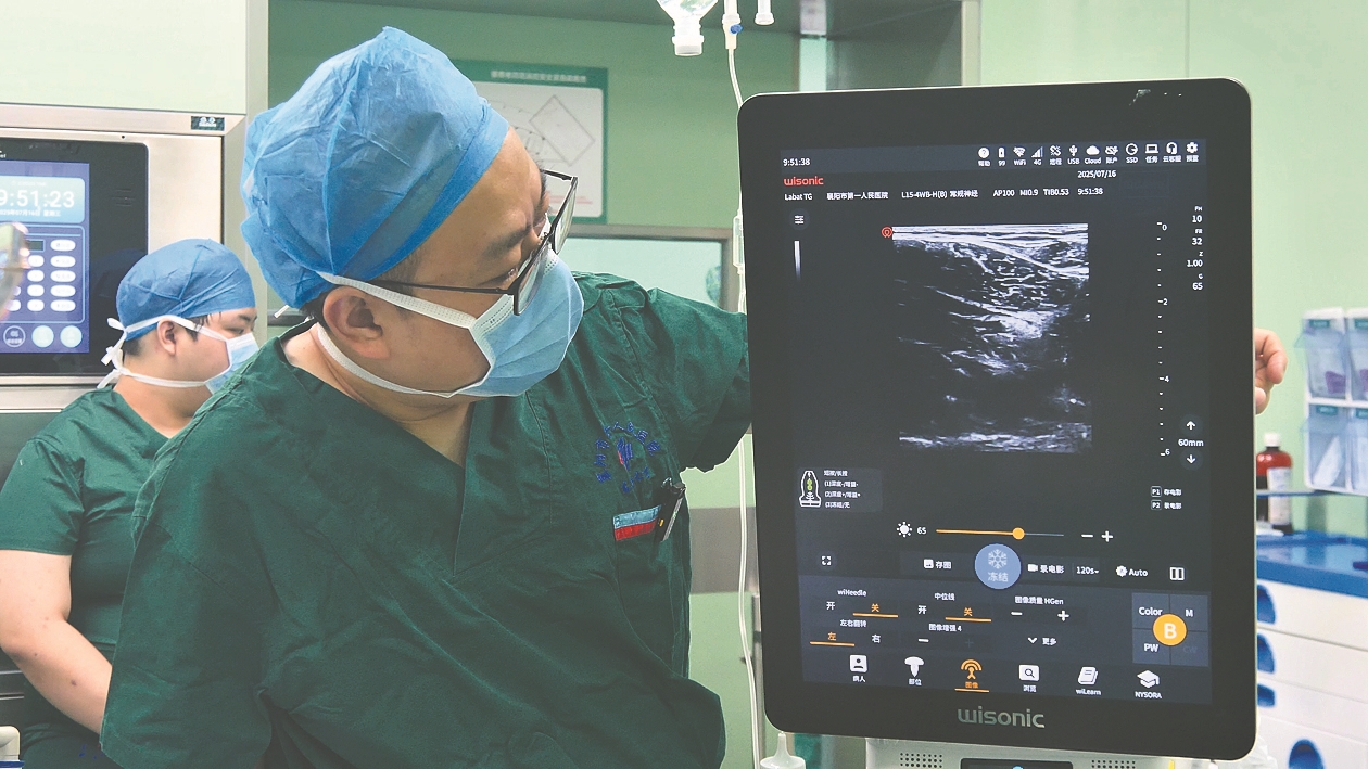 手术中,麻醉医生拿起超声探头,在张先生腹股沟区精准扫描。屏幕上清晰地显示出闭孔神经的走行。在超声的实时“导航”下,麻醉医生将一根细针精准地穿刺到神经附近,注入少量麻醉药。