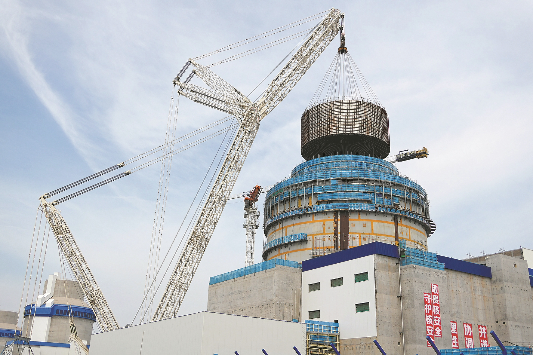 这是8月4日拍摄的山东海阳核电3号机组核岛CB20模块吊装现场。