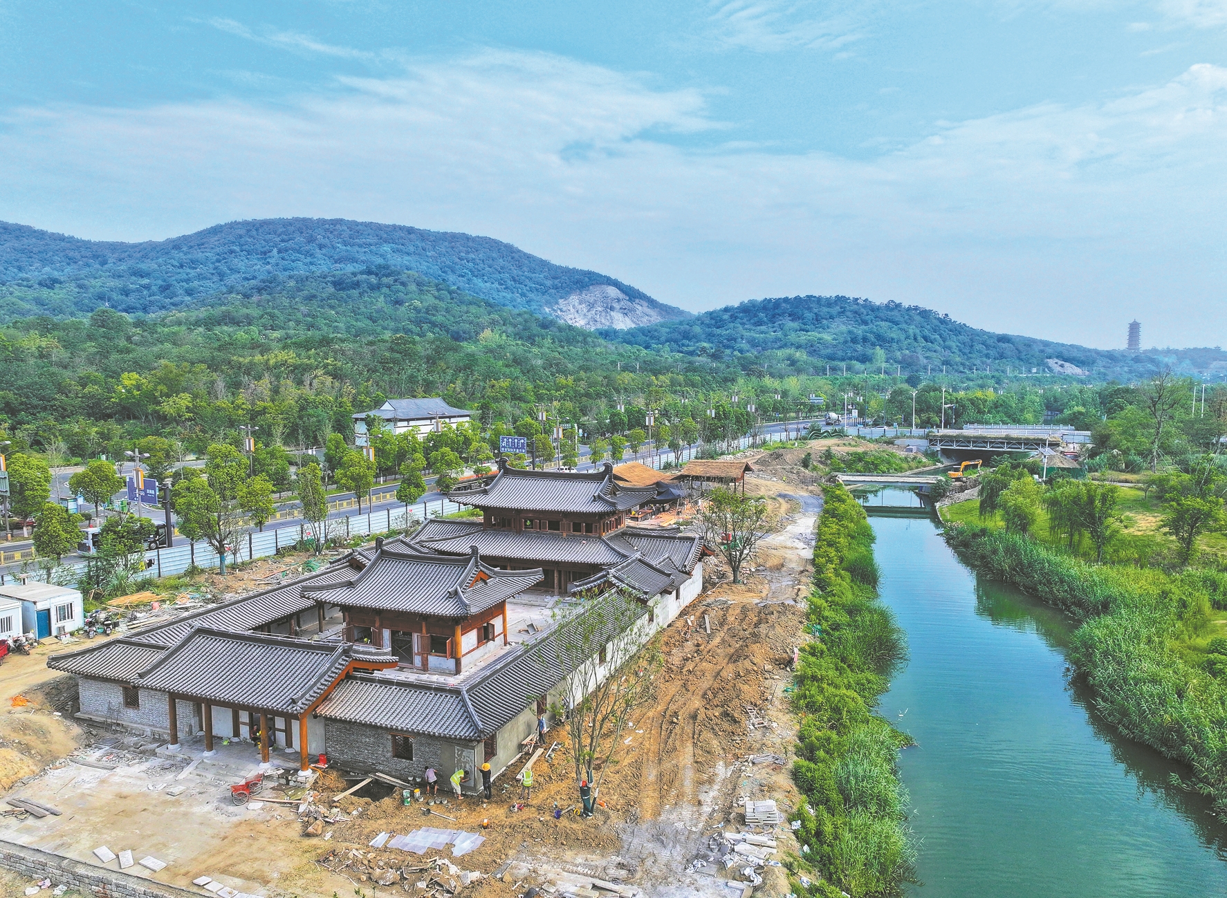 8月5日,工人们在襄水岸线修复生态提升工程涧南园项目工地进行建筑外立面施工,此次建设内容包括孟浩然纪念馆、孟宅等。涧南园是唐代著名山水田园诗人孟浩然的宅园,位于岘山附近。