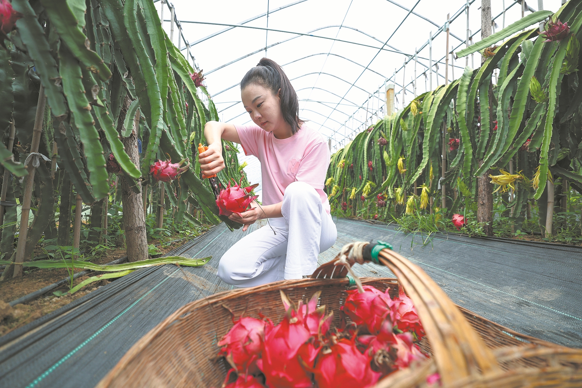 8月8日,游客在襄城区卧龙镇牌坊村火龙果采摘园采摘火龙果。