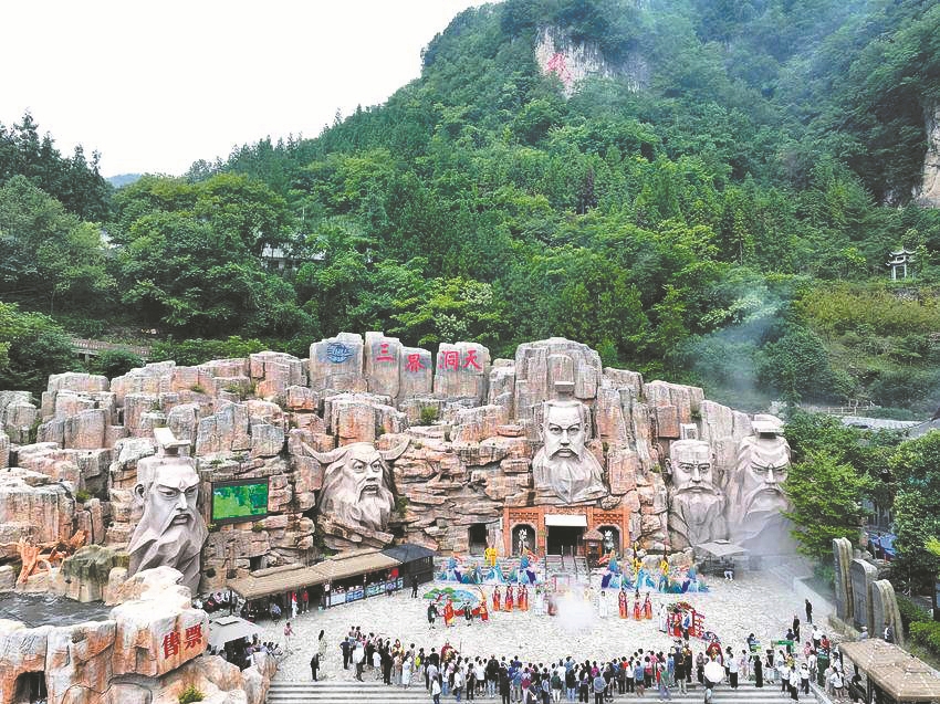 8月7日,在尧治河三界洞天景区入口处,一片精心布置的文旅打卡区成为游客游览的第一站,游客带着小孩观看神话表演,与神话人物在打卡点合影,十分热闹。