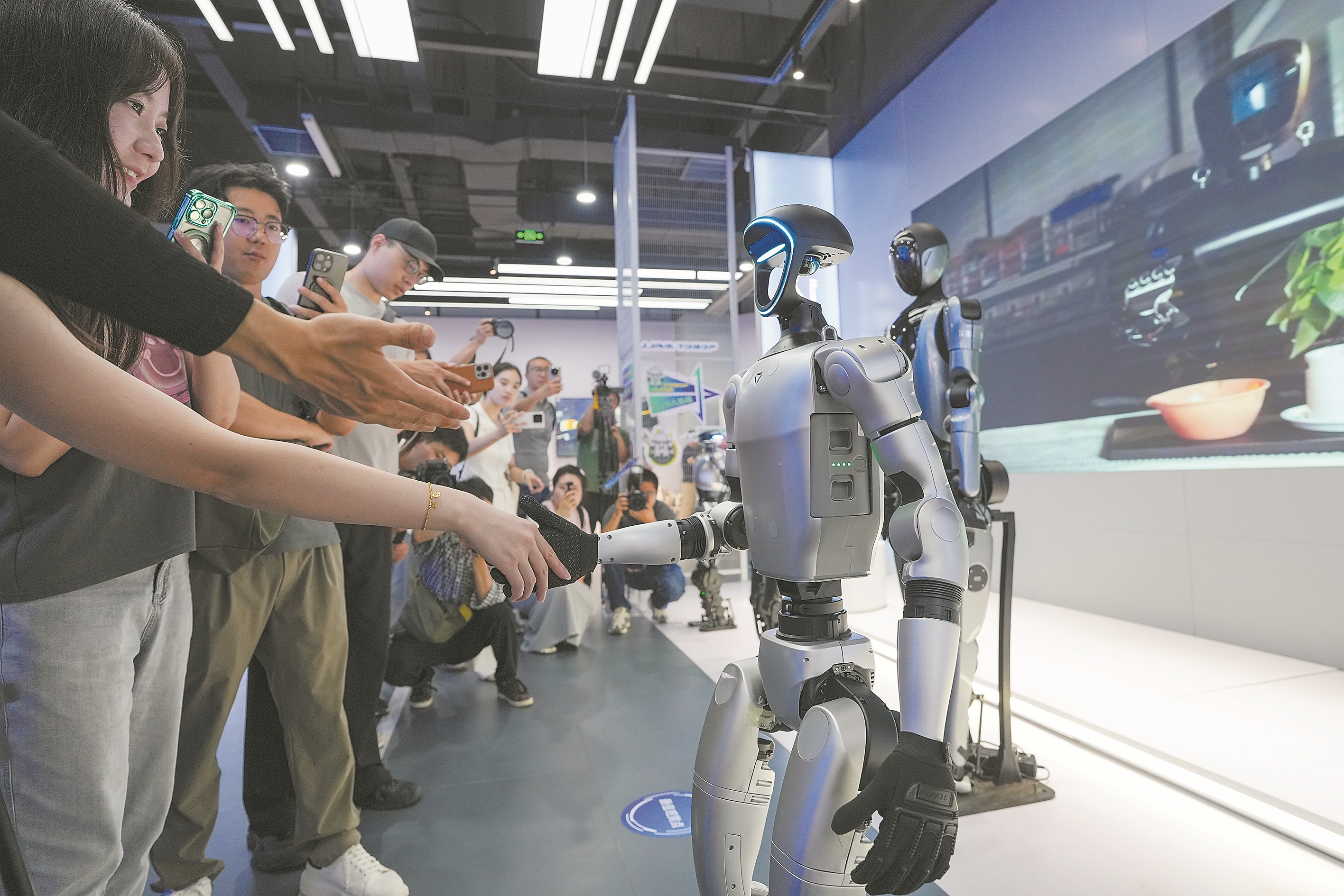 在位于北京经开区机器人大世界的全球首个具身智能机器人4S店(ROBOT MALL)内,观众在与一款人形机器人握手(8月6日摄)。
