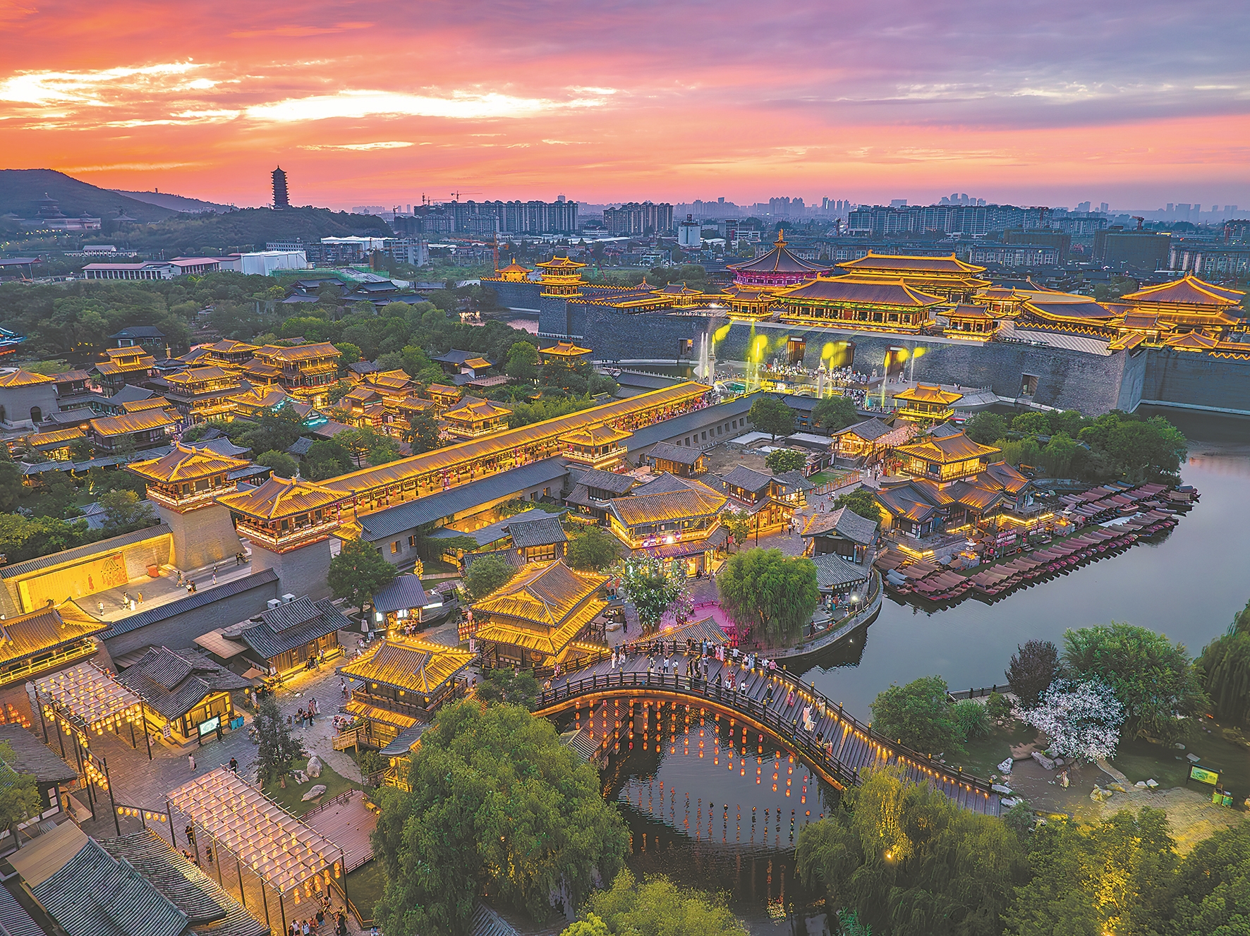 8月11日,唐城景区夜景璀璨,吸引了众多游客前来游玩。