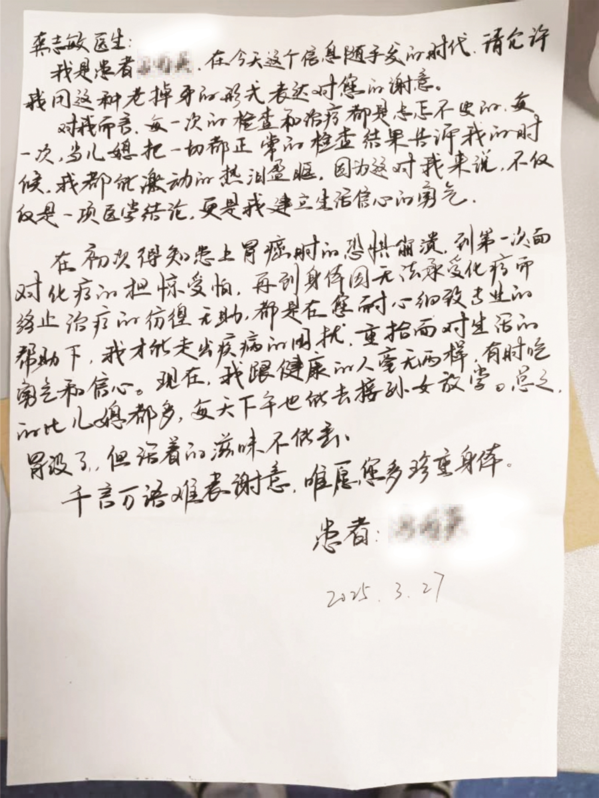 “得知患上胃癌时的恐惧崩溃,第一次面对化疗的担惊受怕,身体因无法承受化疗而停止治疗的彷徨无助……是您一次次用专业和耐心帮助了我。”马女士在信中写道。每一次检查结果出炉前的忐忑,每一次得知一切正常时的热泪盈眶,龚志敏医生不仅为马女士解除了身体病痛,更为她重塑了追求“活着的滋味”的勇气,让她从深渊中一步步走向光明。