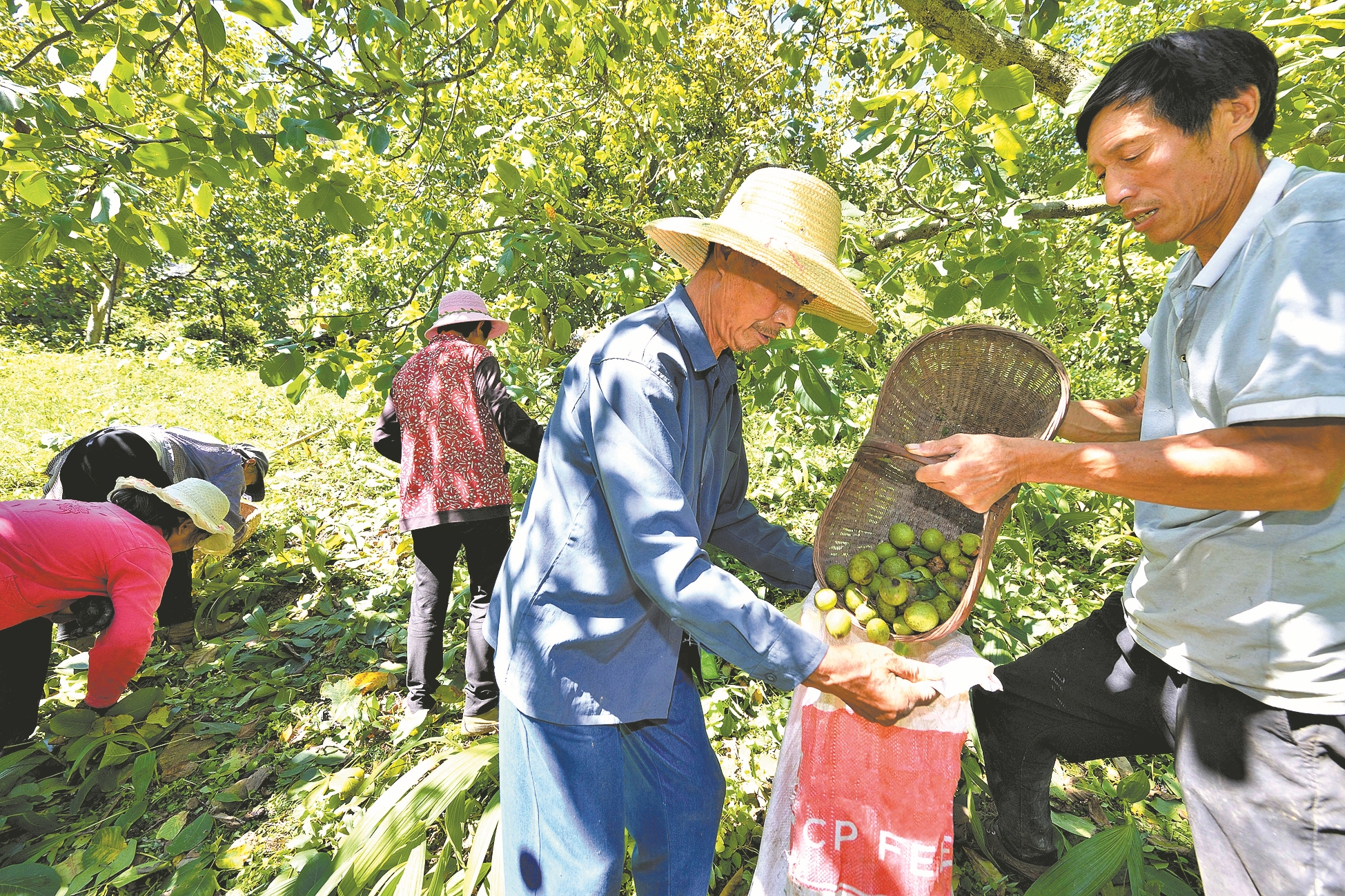8月18日,在保康县寺坪镇樟木沟村核桃种植基地,村民们忙着采收核桃。