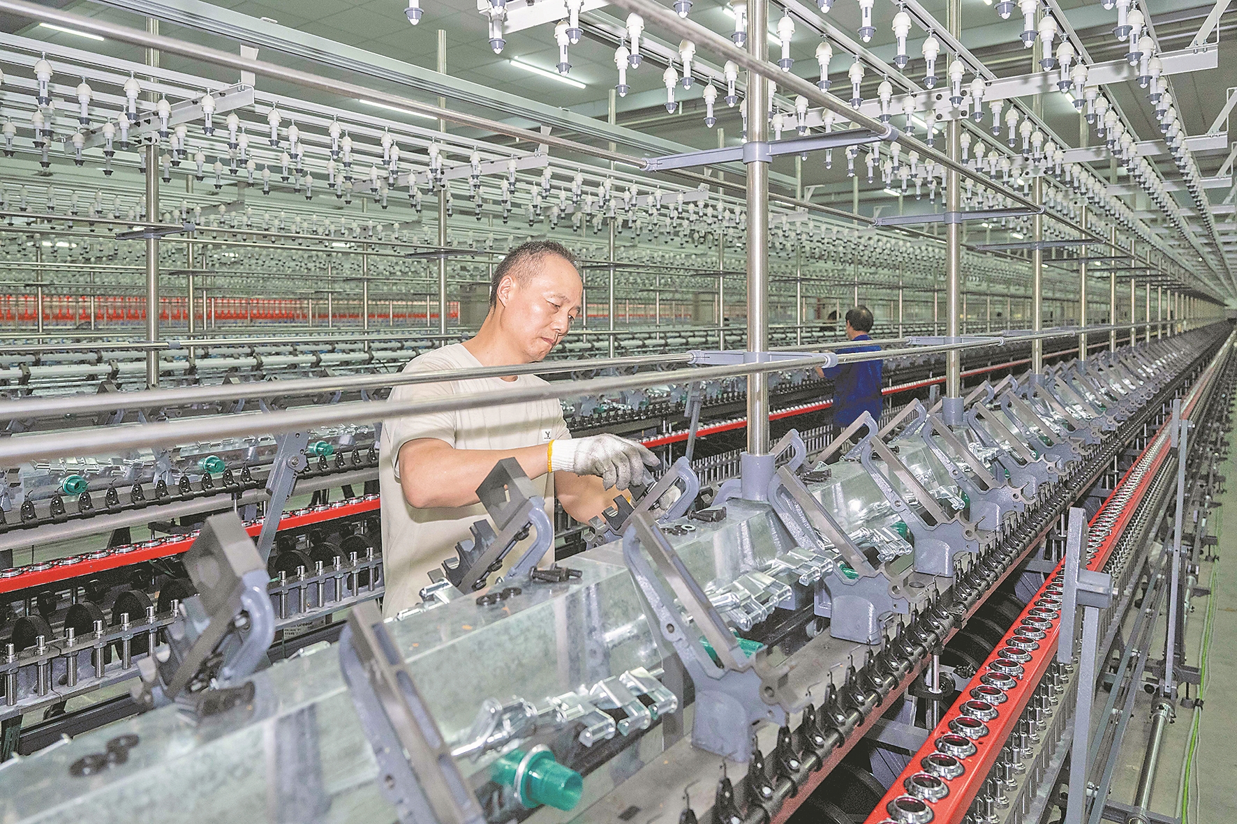 8月19日,在位于谷城县的襄阳裕丰纺织有限公司生产车间,工作人员认真调试环锭纺纱机,保障设备正常运行。据了解,该公司通过“府院联动”盘活存量资产,新建7万锭智能纺纱车间,购置256台高速喷气织机及相关配套设备,从事精梳纱线和精梳面料生产。项目达产后,将新增就业岗位500个,年销售额预计达到4亿元,实现利税2000万元。