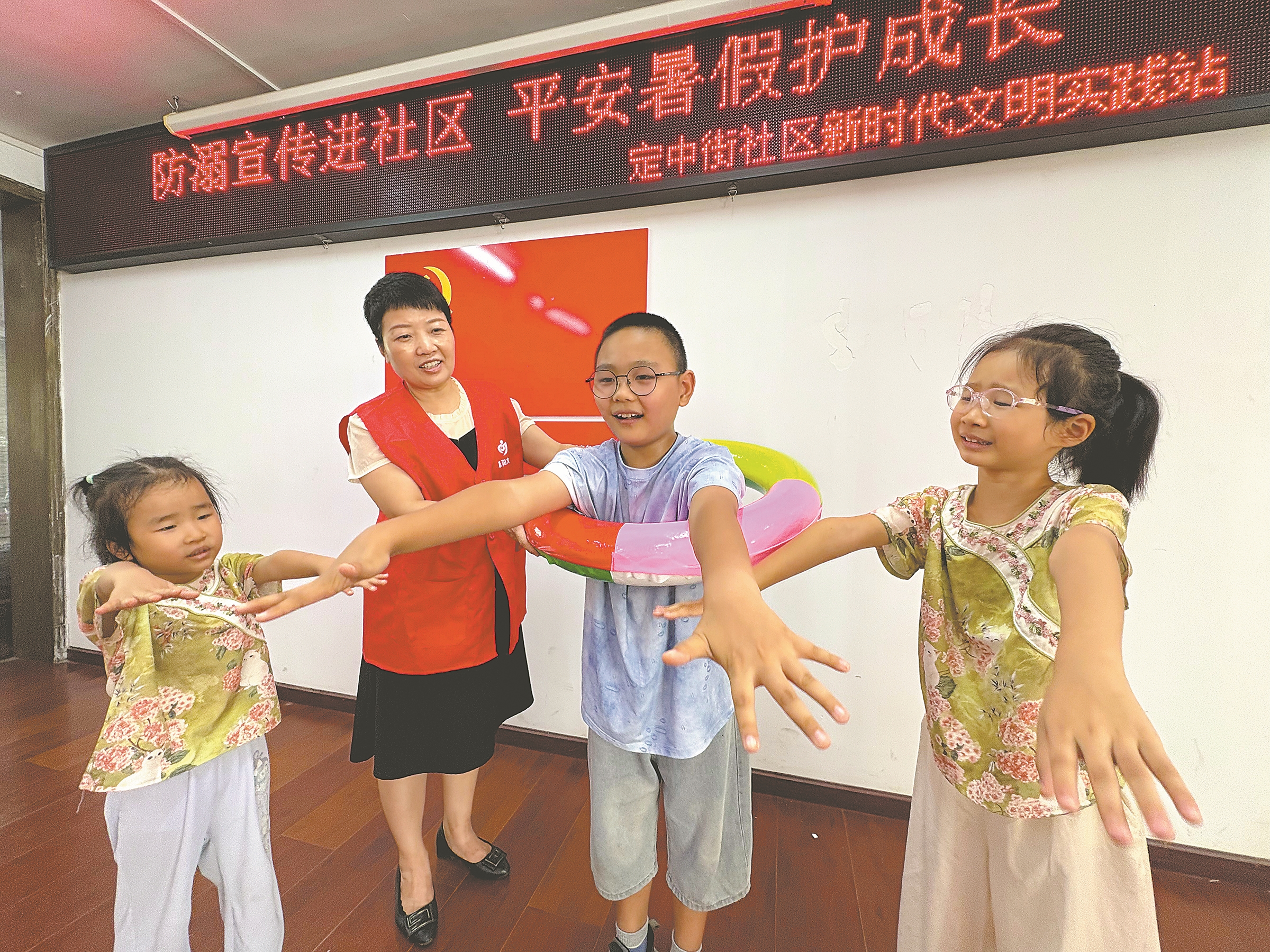 8月20日,在樊城区定中街社区,工作人员向孩子们讲解防溺水知识。今年暑期,我市各社区加大防溺水宣传力度,通过情景模拟、救生衣正确穿戴演示、水中自救技巧教学等方式,帮助孩子们提高自我保护能力。