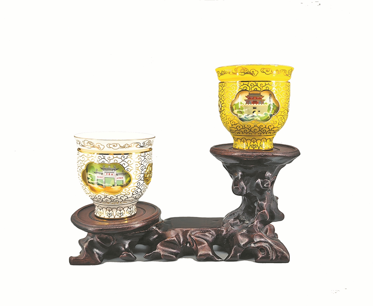 诗景融合——设计团队耗时半年梳理襄阳文化脉络,精选与景点形成关联的历代名诗,将地理坐标与文学记忆精准锚定。通过细腻的插画技艺,将景区风光转化为视觉语言,制成特种花纸高温烧制于杯身,使游客在品茗时既能“见景”亦可“读诗”。双珐琅工艺——陶瓷珐琅源自大地材质,经烈火淬炼尽显温润质感;金丝珐琅承袭景泰蓝非遗基因,通过现代制胎技术与创新点蓝技艺的改良,让画面更清晰、线条更流畅。双珐琅工艺的创新融合,既保留了“火与土”的自然馈赠,又延续了“丝与釉”的宫廷技艺,赋予杯身层次丰富的视觉感动。360°旋转结构——外杯采用金丝珐琅与陶瓷珐琅复合制作,内杯外壁则烧制诗词、插画,通过精密轴承连接实现顺滑旋转,让人们在品茗、把玩间尽赏襄阳景致与诗韵。