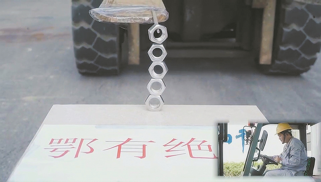 更令人叹为观止的是他“叉车穿针”的绝活。一段8厘米长的细铜丝被固定在叉板前端,他需要操控叉车将其精准穿入立在地面的缝衣针针鼻之中。
