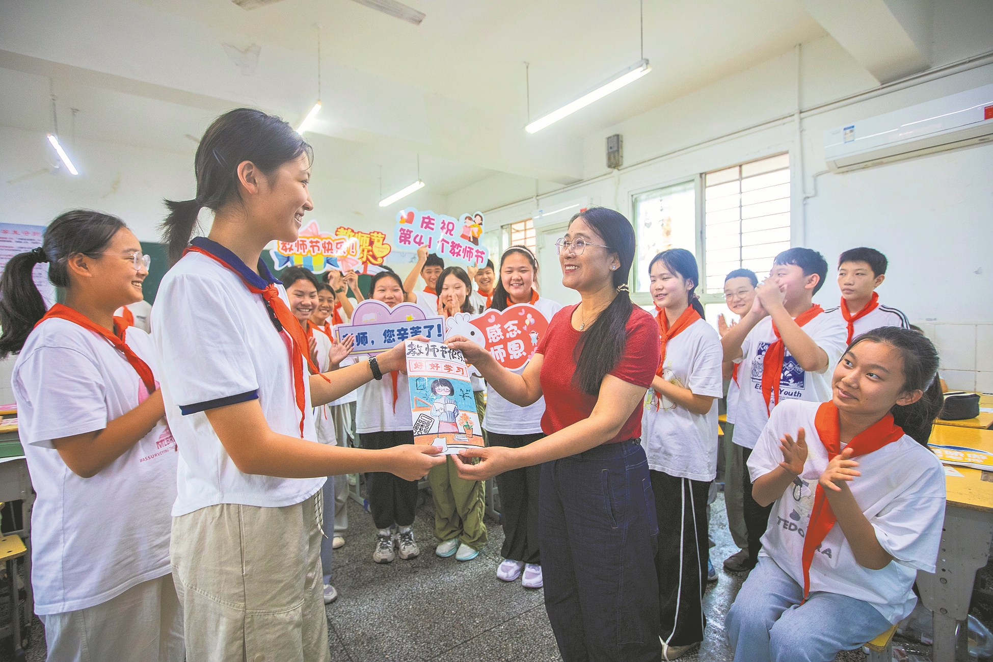 9月8日,在第41个教师节来临之际,市诸葛亮中学的学生创作了绘画作品并赠送给老师。学生们还手持写有“庆祝第41个教师节”“老师,您辛苦了”等话语的KT板,向老师送上祝福。