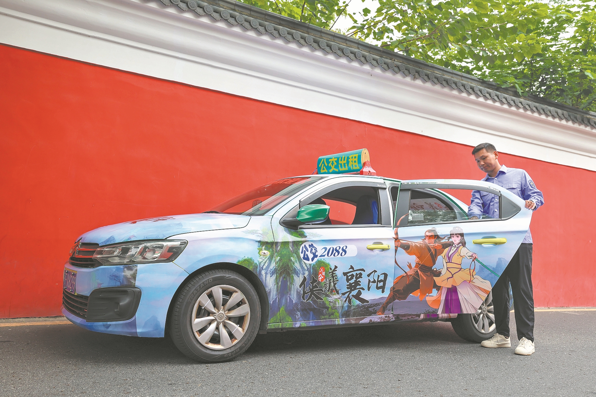 9月15日,襄王府附近,“郭靖黄蓉”文旅主题出租车驾驶员在整理车辆,等待乘客乘车。近日,市公交集团启动“我为襄阳文旅代言”主题活动,“郭靖黄蓉”文旅主题出租车同步首发,车身印着郭靖、黄蓉并肩守襄阳的手绘,车门写着“侠义襄阳”四个大字,成为我市一张移动文旅宣传名片。