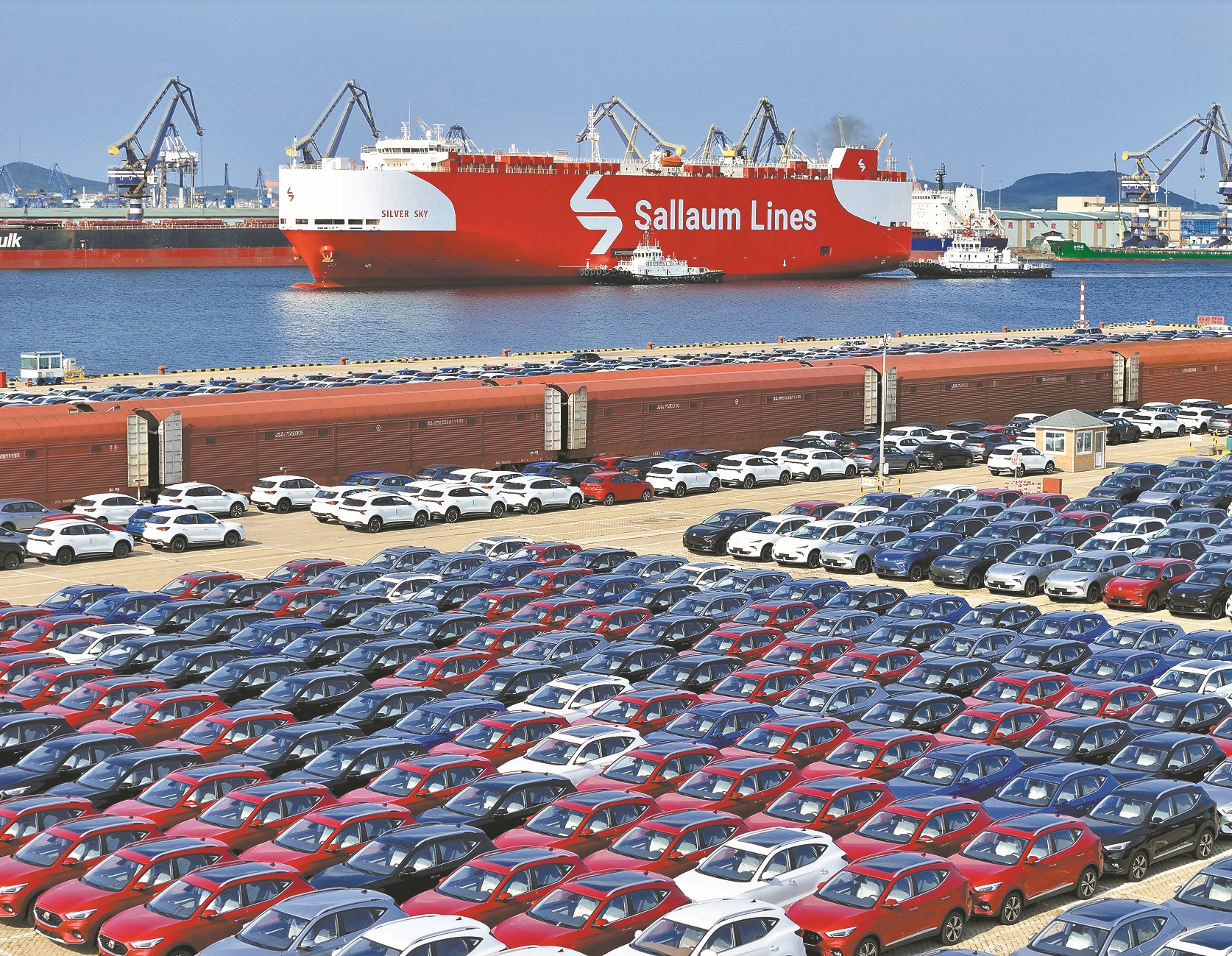 国产汽车在山东港口烟台港集结等待装船出口(9月14日摄,无人机照片)。