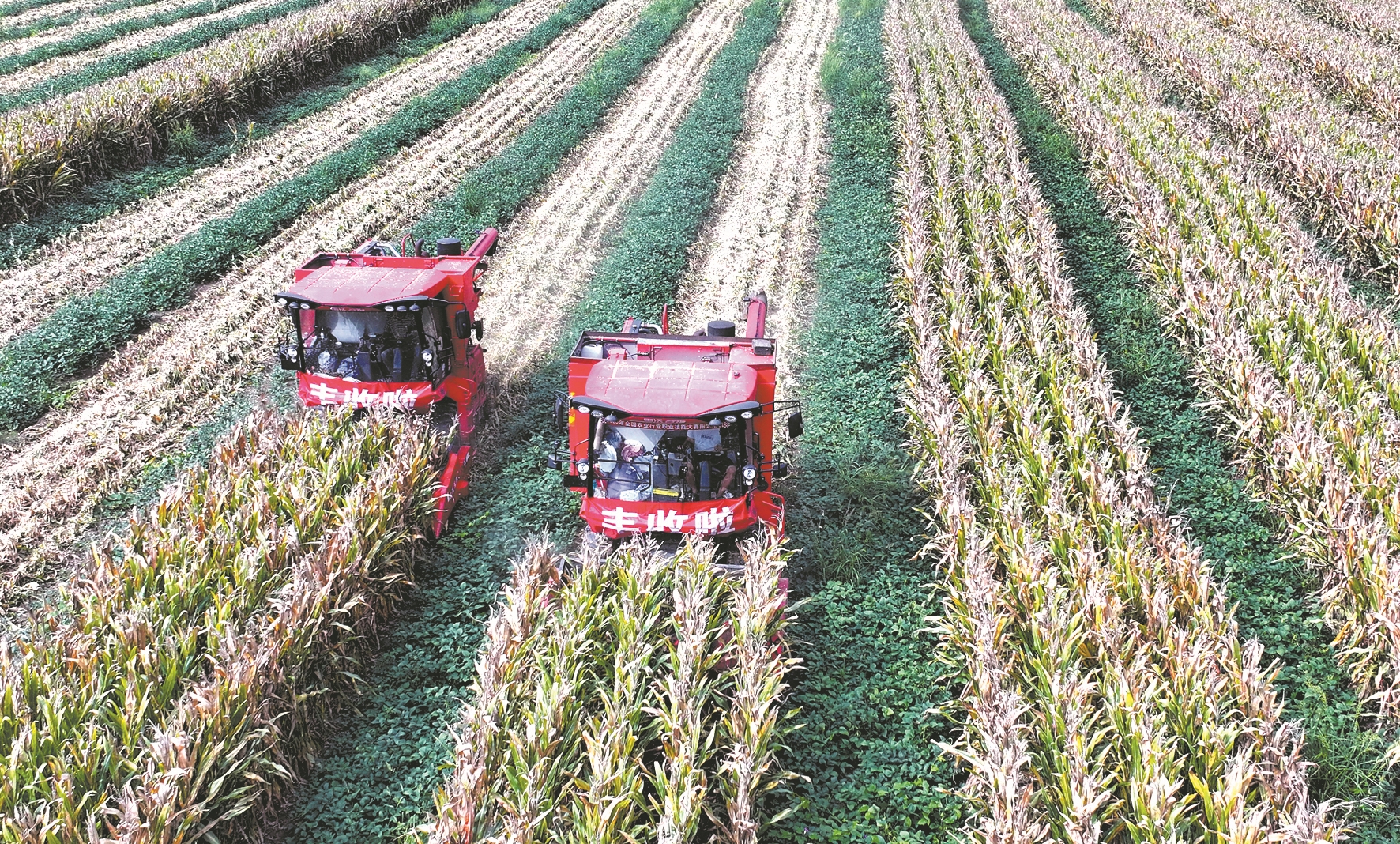 9月15日,收割机正在南漳县武安镇湖北陈家集农业发展有限公司的500亩玉米大豆带状复合种植生产示范基地收获玉米。