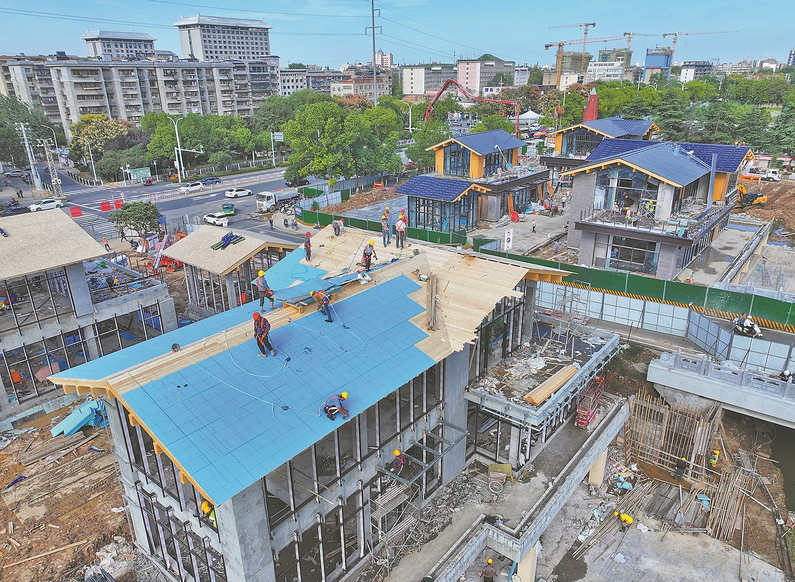 9月20日,在襄水岸线修复生态提升项目(檀溪东真武山片区),工人正进行屋面和外立面施工。