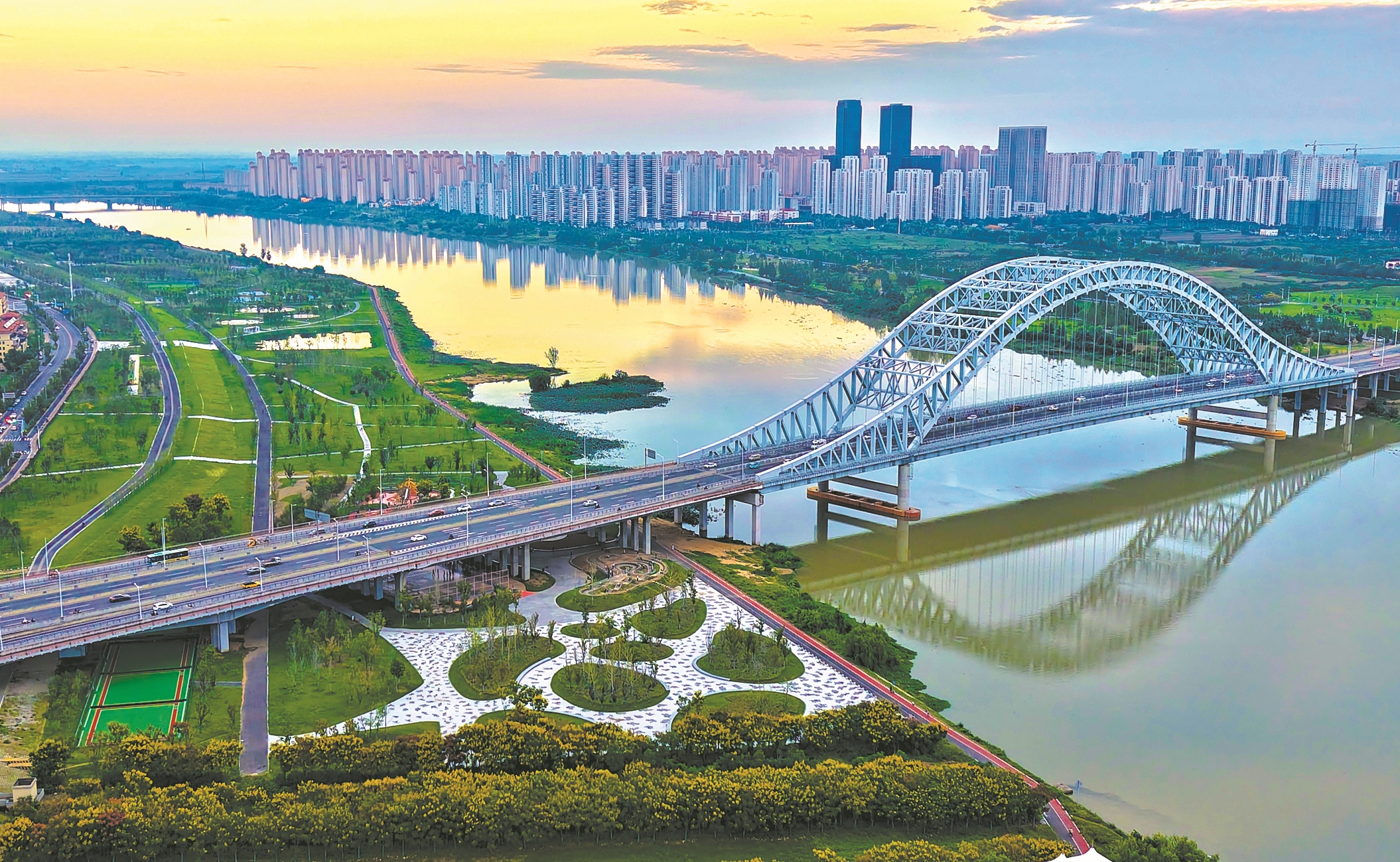 9月22日,襄州区洪山头公园傍晚的景色如画,成为周边居民饭后休闲的好去处。该公园联通唐白河沿岸多个城市公园,93.9万平方米河滩经过生态绿化,实现“水清、岸绿、景美”的滨河生态格局,为市民提供了一个亲近自然、享受生活的美好空间。